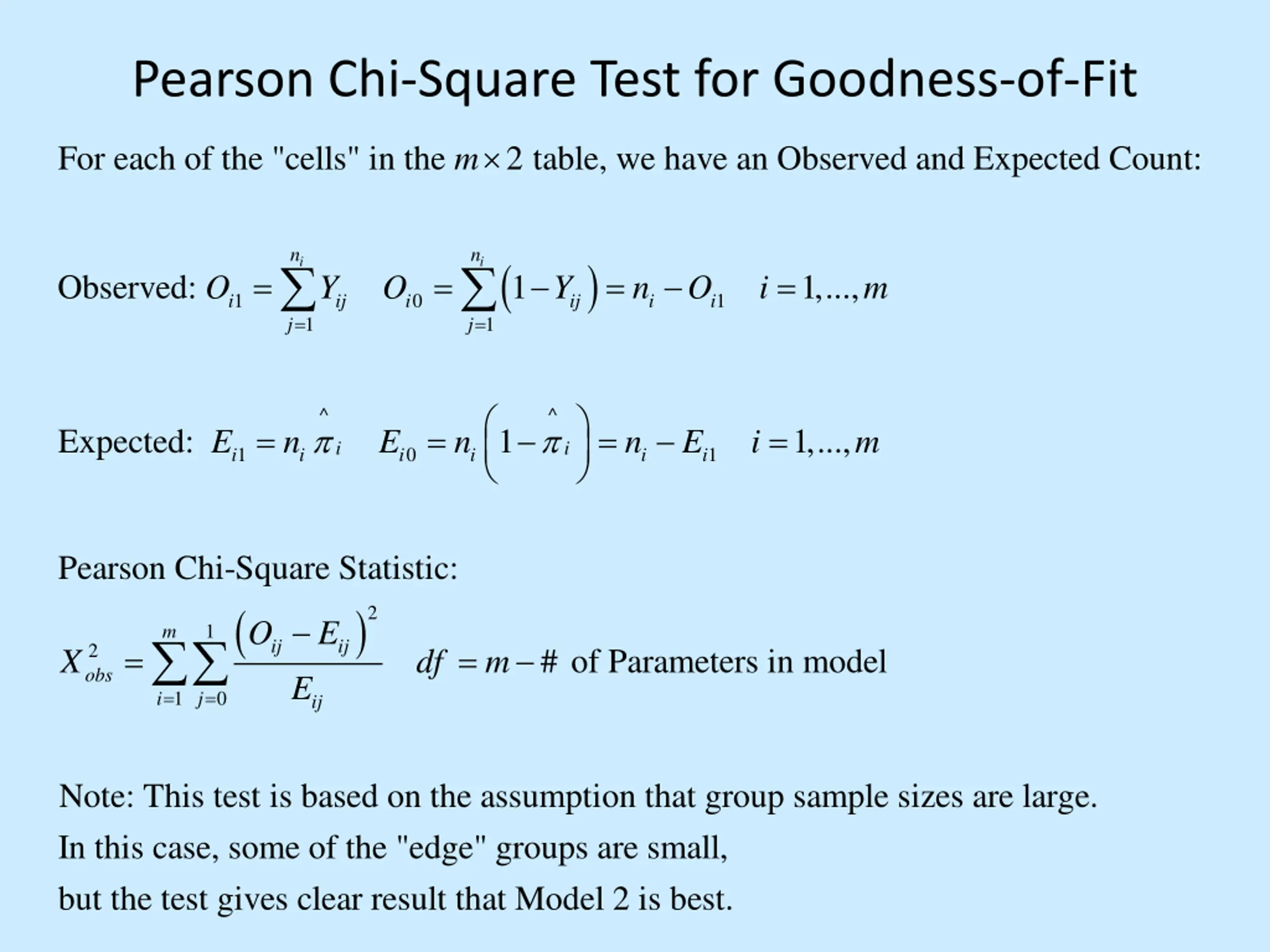 Pearson Chi-Square Test for Goodness-of-Fit For each of the "cells" in the 2 table, we have an Observed and Expected Count: m n n ( ) i i = = = = Observed: 1 1,..., O Y O Y n O i m 1 0 1 i ij i ij i i = = 1 1 j j ^ ^ = = = = Expected: 1 1,..., E n E n n E i m i i 1 0 1 i i i i i i Pearson Chi- Square Statistic: ( ) 2 O E 1 m ij ij = = 2 obs # of Parameters in model X df m E = = 1 0 i j ij Note: This test is based on the assumption that group sample sizes are large. In this case, some of the "edge" groups are smal but the test gives clear result that Model 2 is best. l,
