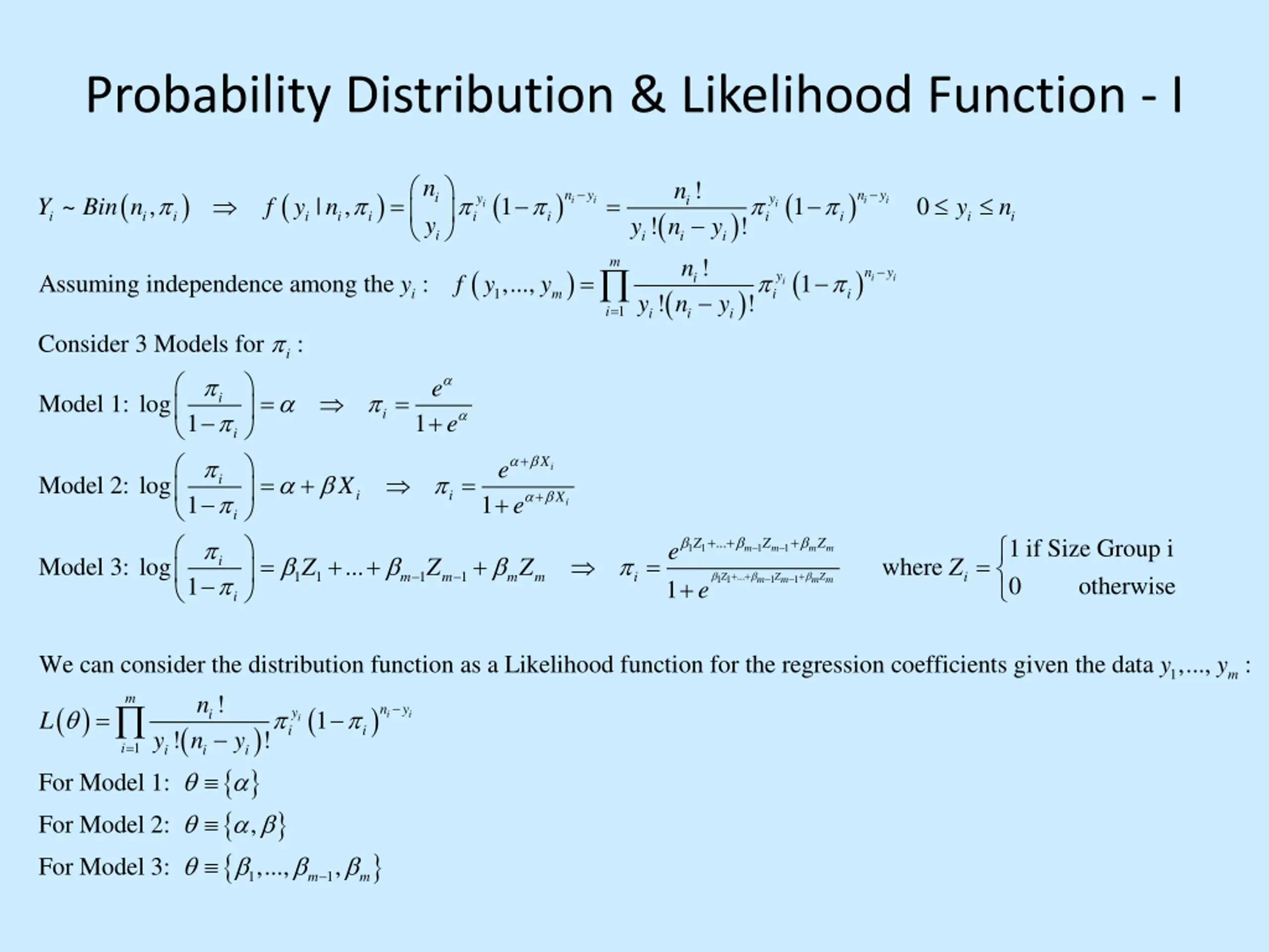 Probability Distribution & Likelihood Function - I n y ! n n ( ) ( ) ( ) ( ) n y n y i = = y y ~ , | , 1 1 0 i Y Bin n f y n y n i i i i i i ( ) i i i i i i i i i i i i ! ! y y i i i n n i ! m ( ) ( ) n y = y Assuming independence among the : ,..., 1 i y f y y i i i ( ) 1 i m i i ! ! y y = 1 i i i i Consider 3 Models for : i = = = e + = Model 1: log i i 1 1 e i + X e + i + = Model 2: log i X i i + X 1 1 e i i 1 1 Z + + + 1 if Size Group i 0 otherwise ... Z Z e 1 1 m m m m + + + = = Model 3: log ... where i Z Z Z Z 1 1 1 1 m m m m i i 1 1 Z + + m m + ... Z Z 1 + 1 1 m m 1 e i We can consider the distribution function as a Likelihood function for the regression coefficients given the data ,..., ! 1 ! ! i i i i y n y = 1 1 For Model 3: ,..., , m m : y y 1 m m n ( ) ( ) n y = y i L i i i ( ) i i 1 For Model 1: For Model 2: ,