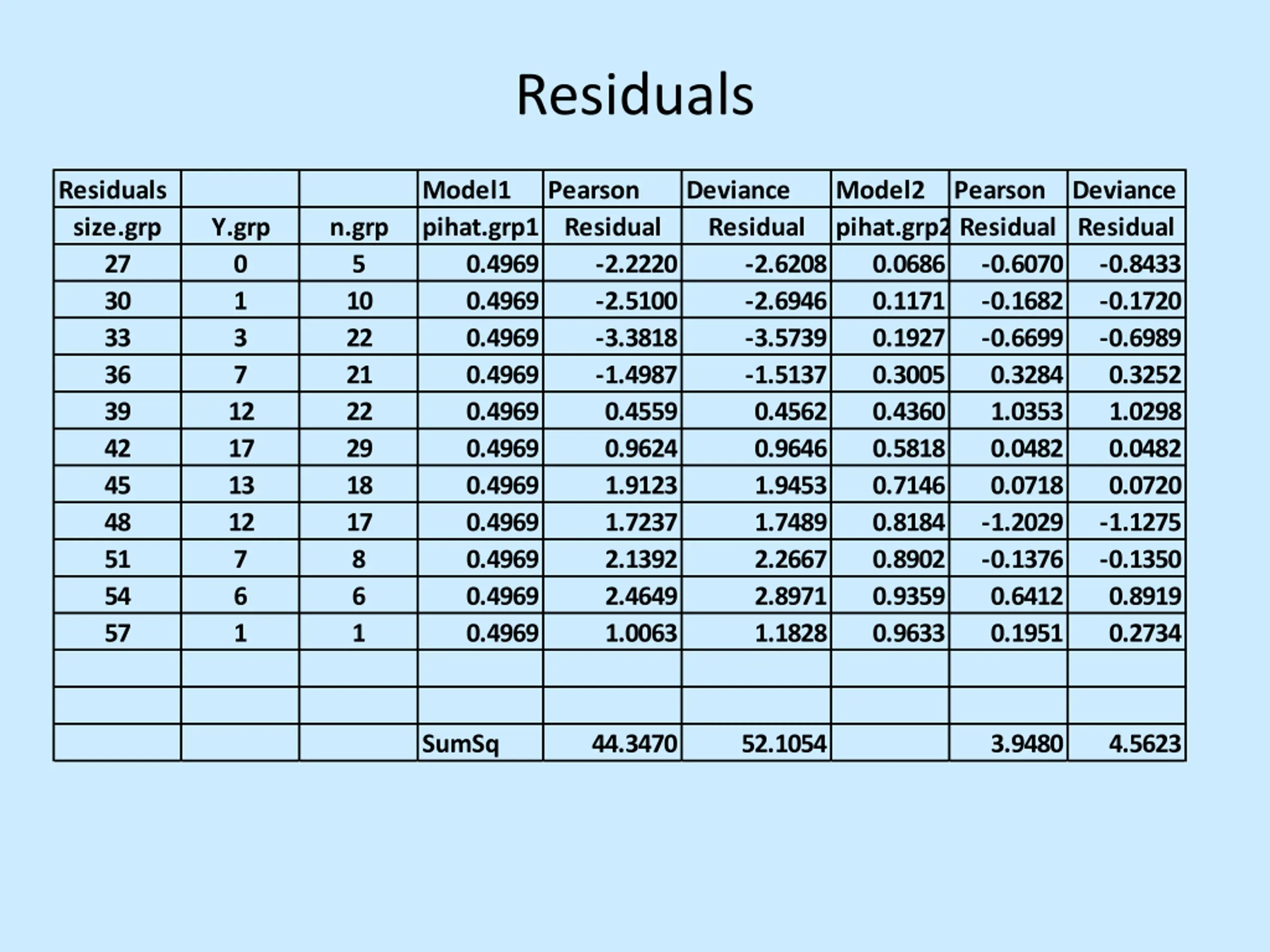 Residuals Residuals size.grp 27 30 33 36 39 42 45 48 51 54 57 Model1 pihat.grp1 Residual 0.4969 0.4969 0.4969 0.4969 0.4969 0.4969 0.4969 0.4969 0.4969 0.4969 0.4969 Pearson Deviance Residual -2.6208 -2.6946 -3.5739 -1.5137 0.4562 0.9646 1.9453 1.7489 2.2667 2.8971 1.1828 Model2 pihat.grp2 Residual Residual 0.0686 -0.6070 0.1171 -0.1682 0.1927 -0.6699 0.3005 0.3284 0.4360 1.0353 0.5818 0.0482 0.7146 0.0718 0.8184 -1.2029 0.8902 -0.1376 0.9359 0.6412 0.9633 0.1951 Pearson Deviance Y.grp 0 1 3 7 12 17 13 12 7 6 1 n.grp 5 10 22 21 22 29 18 17 8 6 1 -2.2220 -2.5100 -3.3818 -1.4987 0.4559 0.9624 1.9123 1.7237 2.1392 2.4649 1.0063 -0.8433 -0.1720 -0.6989 0.3252 1.0298 0.0482 0.0720 -1.1275 -0.1350 0.8919 0.2734 SumSq 44.3470 52.1054 3.9480 4.5623