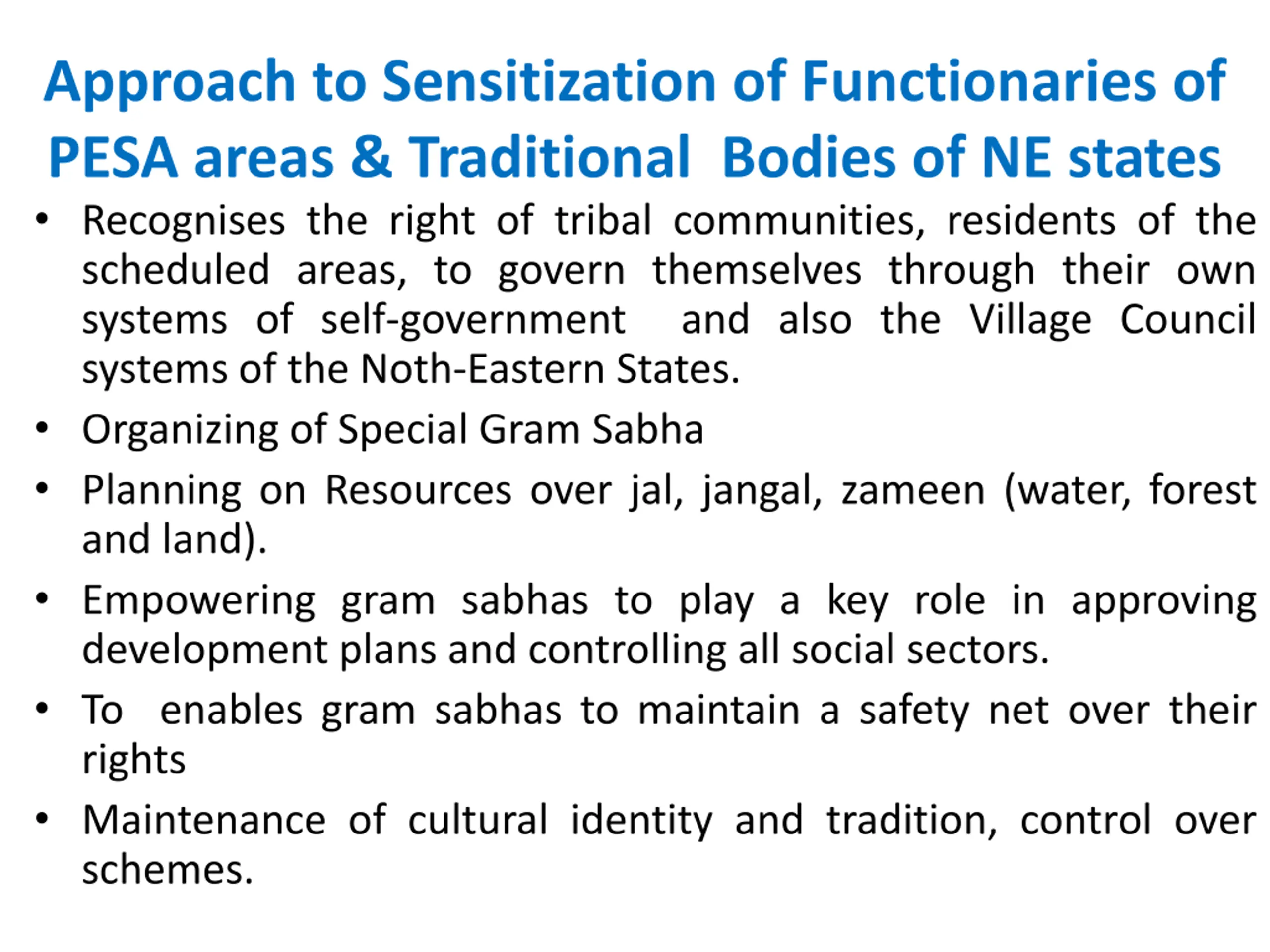 Approach to Sensitization of Functionaries of PESA areas & Traditional Bodies of NE states Recognises the right of tribal communities, residents of the scheduled areas, to govern themselves through their own systems of self-government and also the Village Council systems of the Noth-Eastern States. Organizing of Special Gram Sabha Planning on Resources over jal, jangal, zameen (water, forest and land). Empowering gram sabhas to play a key role in approving development plans and controlling all social sectors. To enables gram sabhas to maintain a safety net over their rights Maintenance of cultural identity and tradition, control over schemes.