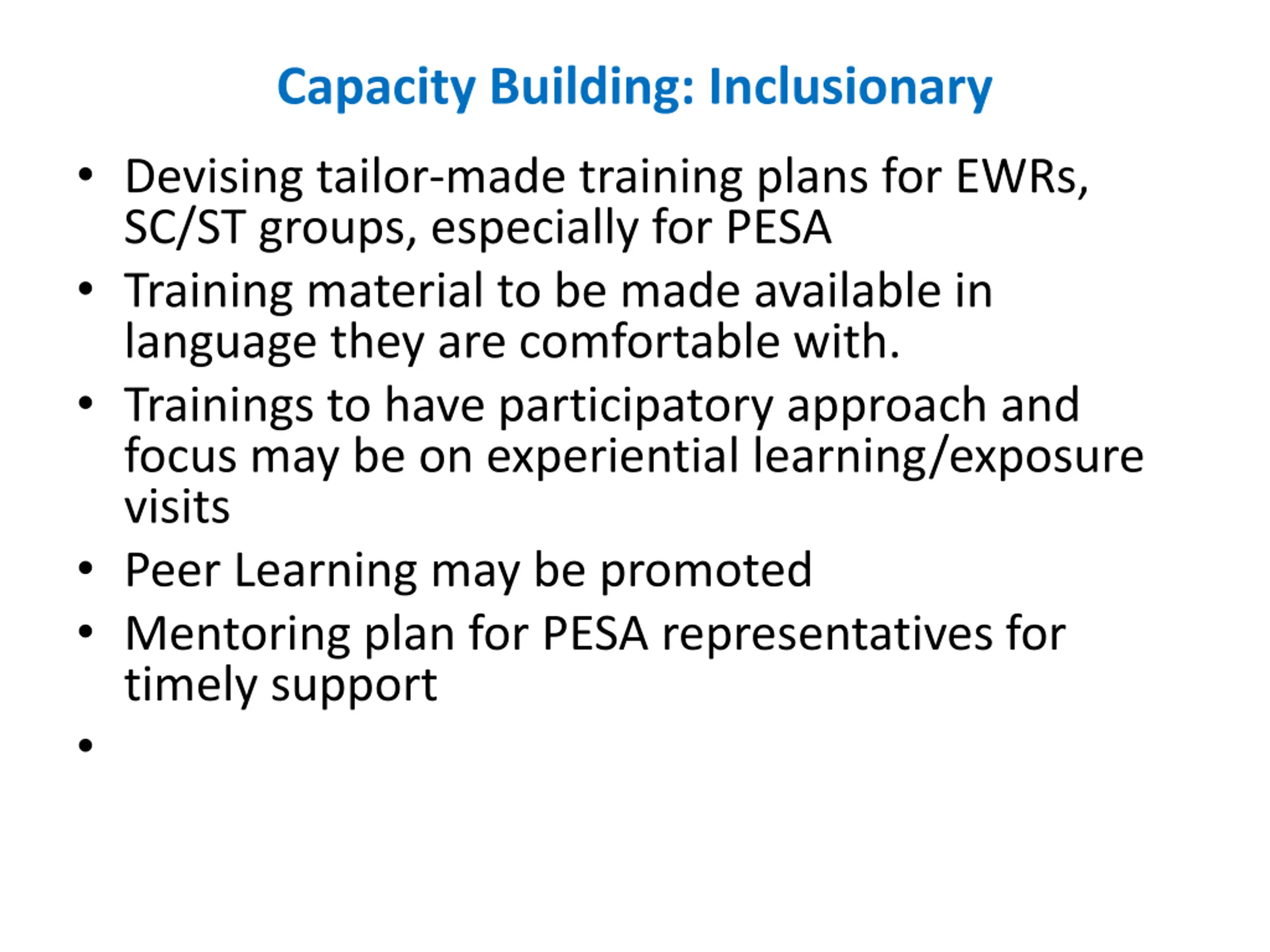 Capacity Building: Inclusionary Devising tailor-made training plans for EWRs, SC/ST groups, especially for PESA Training material to be made available in language they are comfortable with. Trainings to have participatory approach and focus may be on experiential learning/exposure visits Peer Learning may be promoted Mentoring plan for PESA representatives for timely support