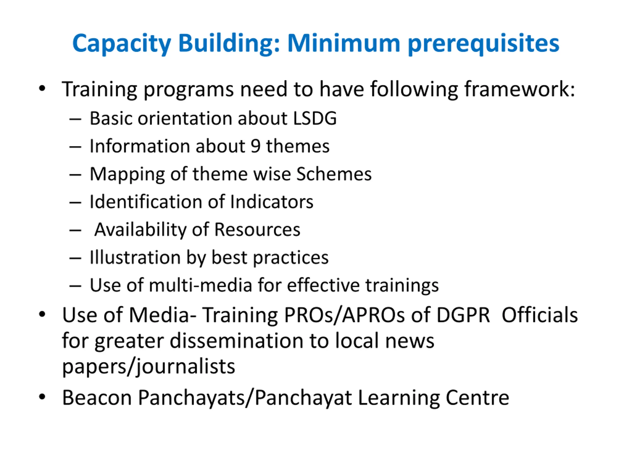 Capacity Building: Minimum prerequisites Training programs need to have following framework: Basic orientation about LSDG Information about 9 themes Mapping of theme wise Schemes Identification of Indicators Availability of Resources Illustration by best practices Use of multi-media for effective trainings Use of Media- Training PROs/APROs of DGPR Officials for greater dissemination to local news papers/journalists Beacon Panchayats/Panchayat Learning Centre