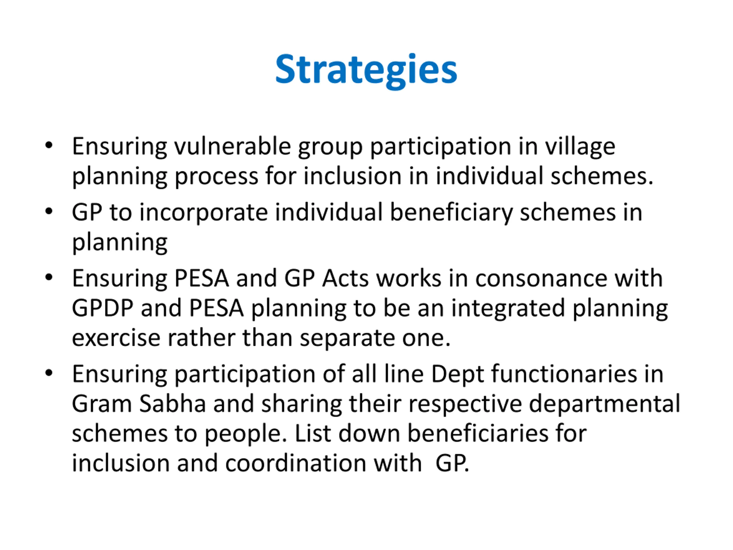 Strategies Ensuring vulnerable group participation in village planning process for inclusion in individual schemes. GP to incorporate individual beneficiary schemes in planning Ensuring PESA and GP Acts works in consonance with GPDP and PESA planning to be an integrated planning exercise rather than separate one. Ensuring participation of all line Dept functionaries in Gram Sabha and sharing their respective departmental schemes to people. List down beneficiaries for inclusion and coordination with GP.
