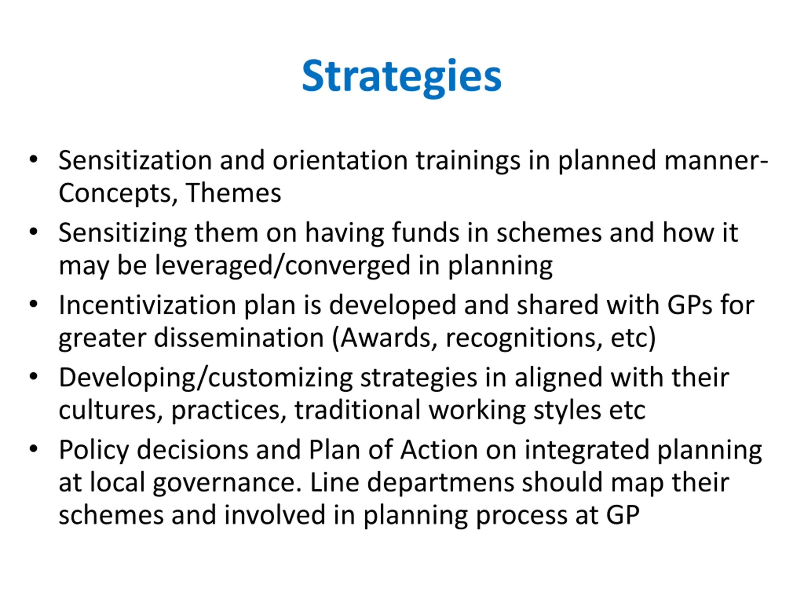 Strategies Sensitization and orientation trainings in planned manner- Concepts, Themes Sensitizing them on having funds in schemes and how it may be leveraged/converged in planning Incentivization plan is developed and shared with GPs for greater dissemination (Awards, recognitions, etc) Developing/customizing strategies in aligned with their cultures, practices, traditional working styles etc Policy decisions and Plan of Action on integrated planning at local governance. Line departmens should map their schemes and involved in planning process at GP