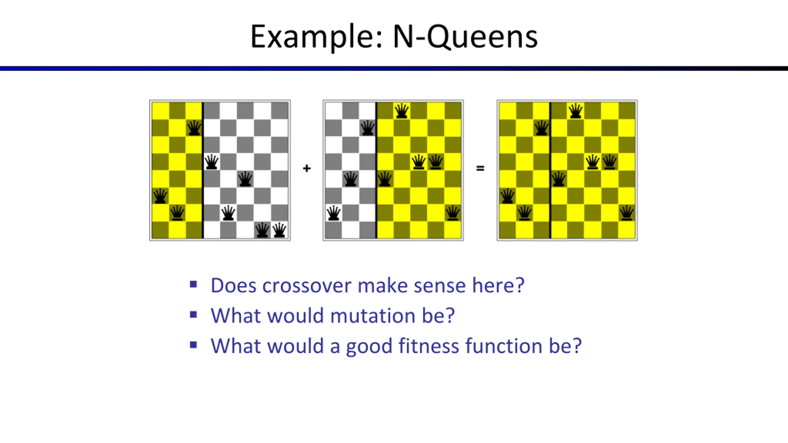 Example: N-Queens Does crossover make sense here? What would mutation be? What would a good fitness function be?