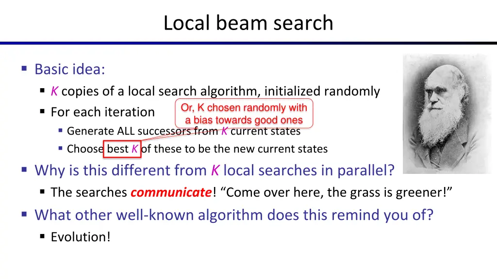 Local beam search Basic idea: K copies of a local search algorithm, initialized randomly For each iteration Generate ALL successors from K current states Choose best K of these to be the new current states Why is this different from K local searches in parallel? The searches communicate! Come over here, the grass is greener! What other well-known algorithm does this remind you of? Evolution! Or, K chosen randomly with a bias towards good ones