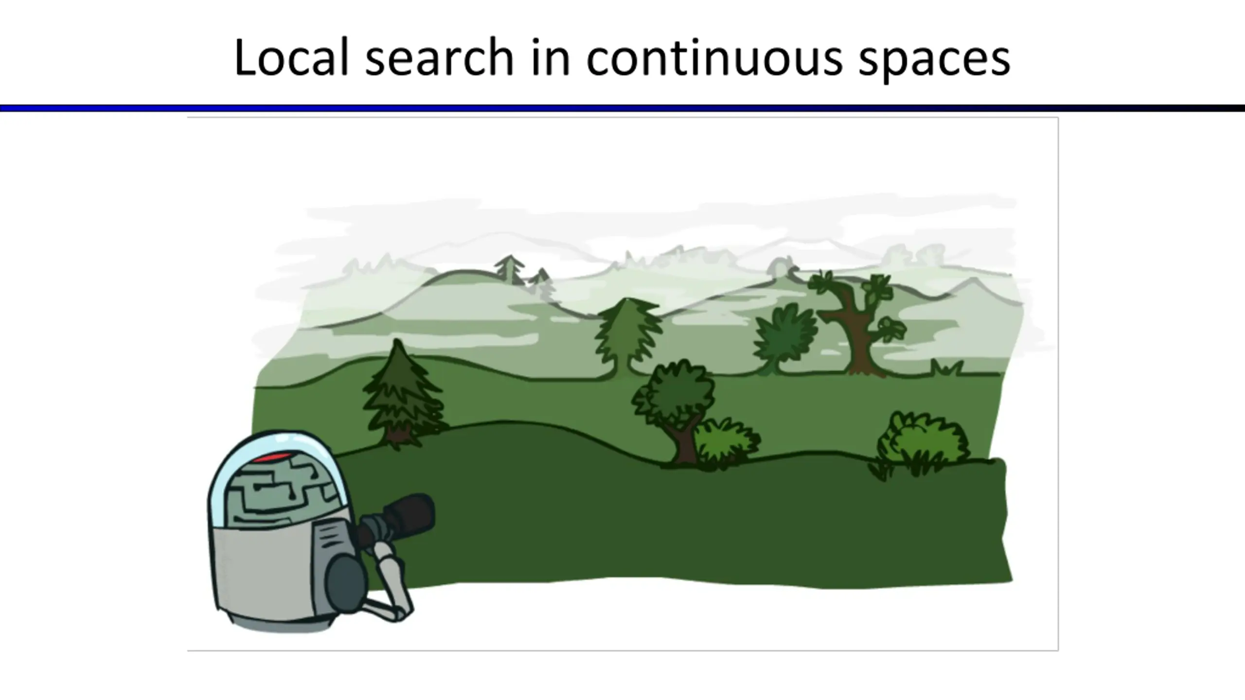 Local search algorithms In many optimization problems, path is irrelevant; the goal state is the solution Then state space = set of complete configurations; find configuration satisfying constraints, e.g., n-queens problem; or, find optimal configuration, e.g., travelling salesperson problem In such cases, can use iterative improvement algorithms: keep a single current state, try to improve it Constant space, suitable for online as well as offline search More or less unavoidable if the state is yourself (i.e., learning)