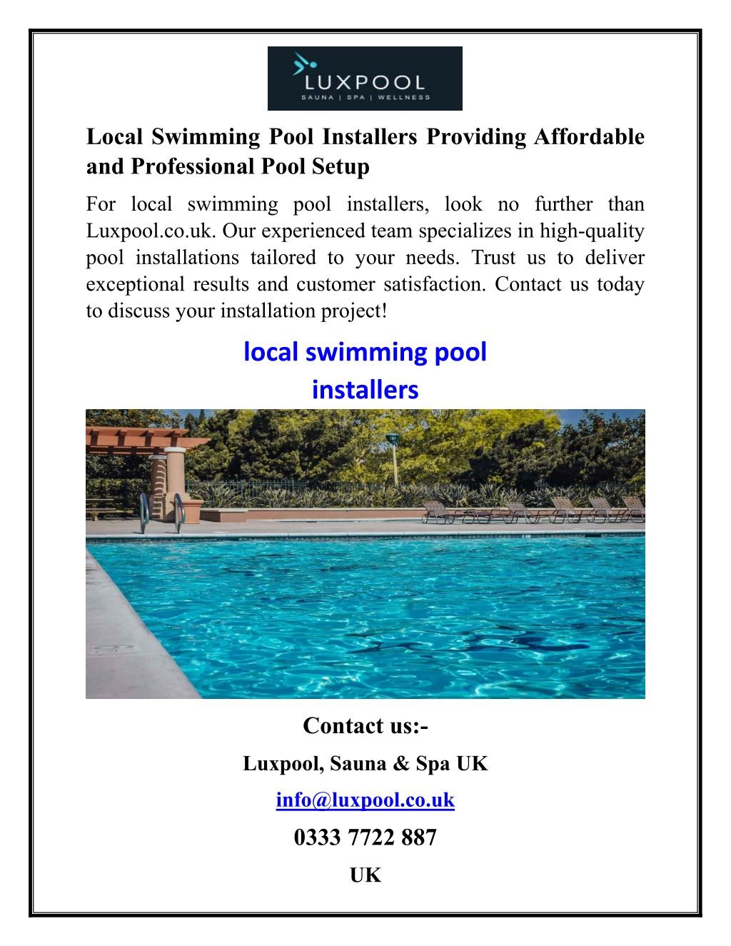 Local Swimming Pool Installers Providing Affordable and Professional Pool Setup For local swimming pool installers, look no further than Luxpool.co.uk. Our experienced team specializes in high-quality pool installations tailored to your needs. Trust us to deliver exceptional results and customer satisfaction. Contact us today to discuss your installation project! local swimming pool installers Contact us:- Luxpool, Sauna & Spa UK info@luxpool.co.uk 0333 7722 887 UK