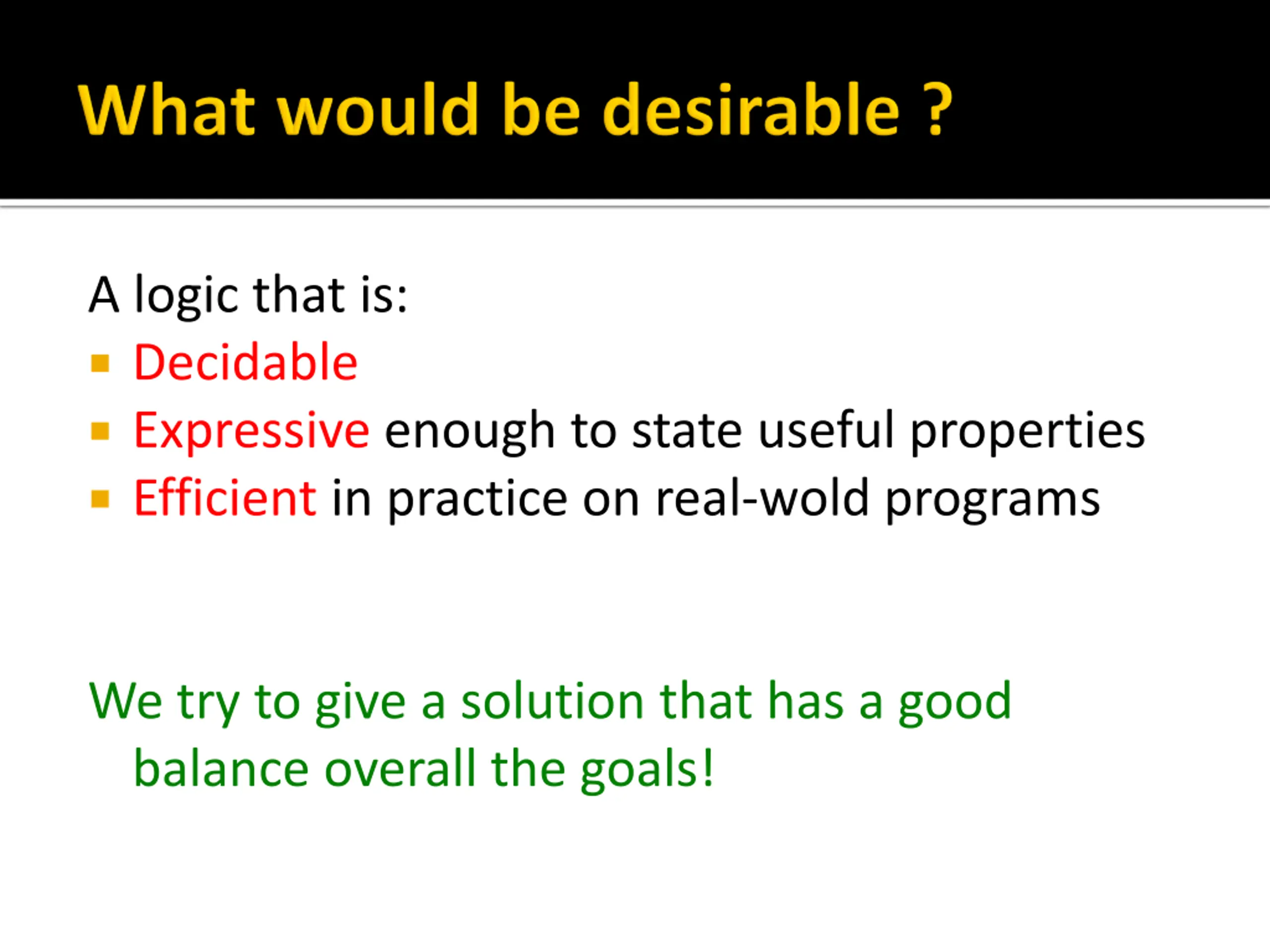 A logic that is: Decidable Expressive enough to state useful properties Efficient in practice on real-wold programs We try to give a solution that has a good balance overall the goals!