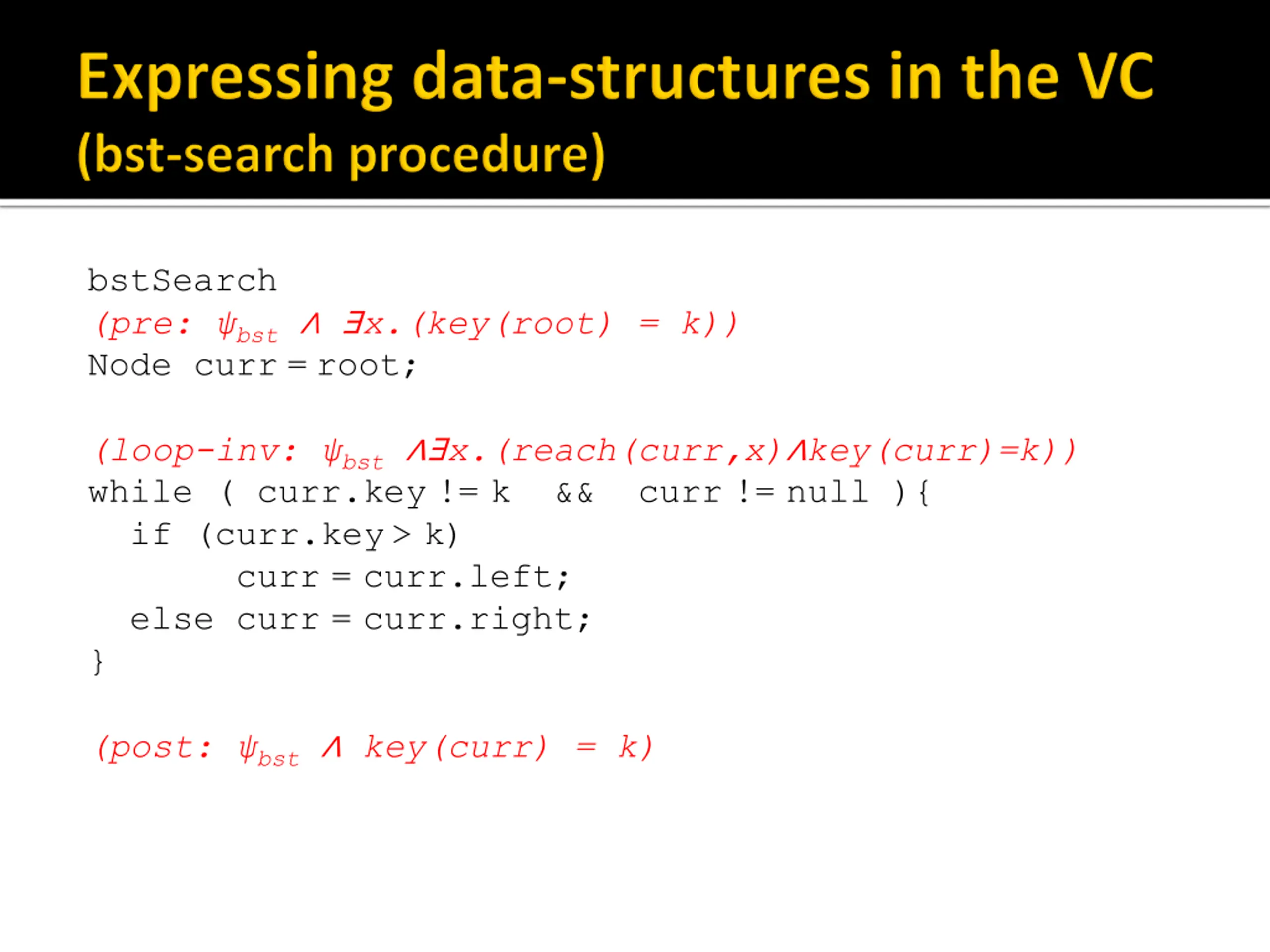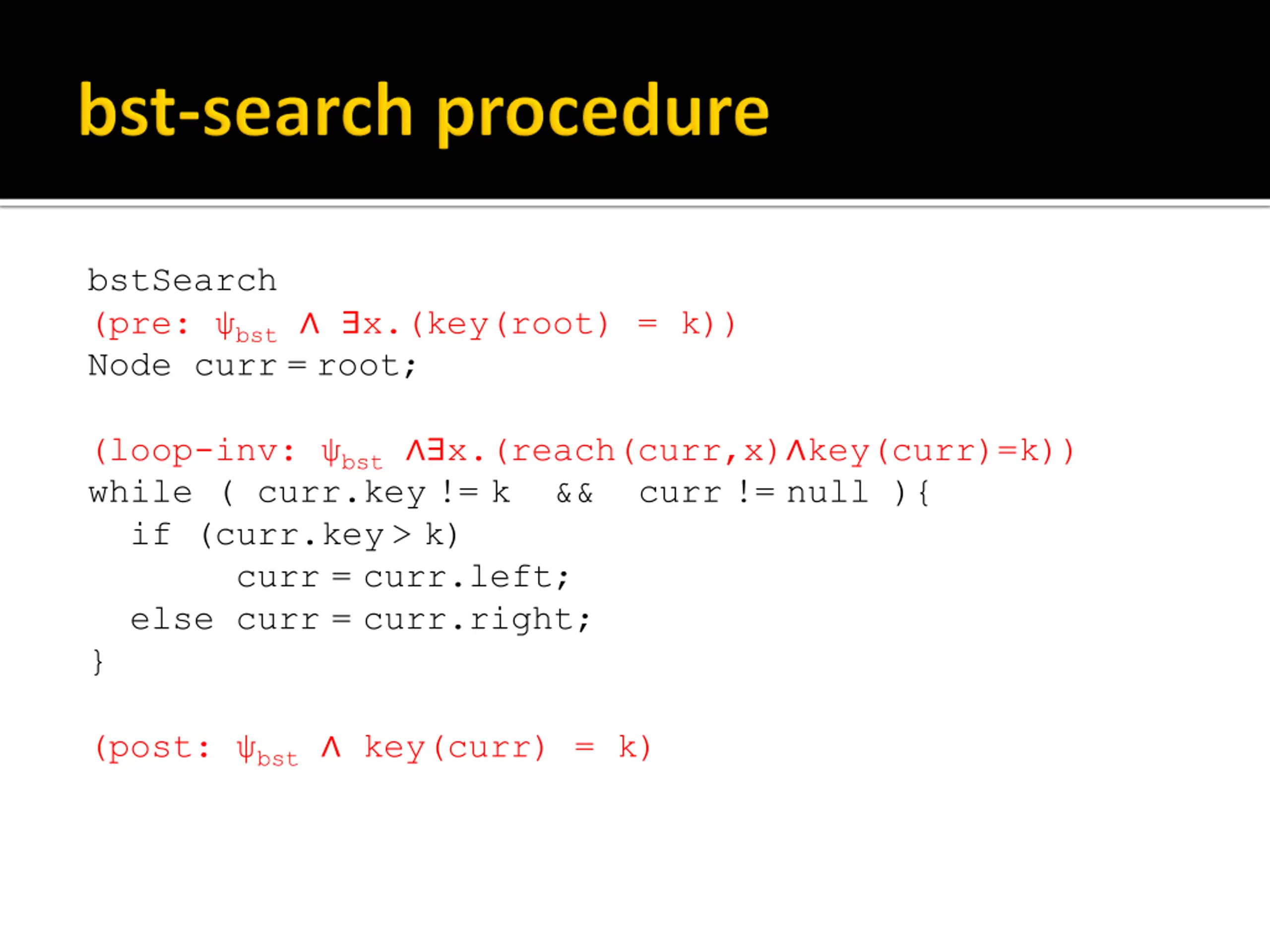 bstSearch (pre: bst x.(key(root) = k)) Node curr=root; (loop-inv: bst x.(reach(curr,x) key(curr)=k)) while ( curr.key!=k && curr!=null ){ if (curr.key>k) curr=curr.left; else curr=curr.right; } (post: bst key(curr) = k)