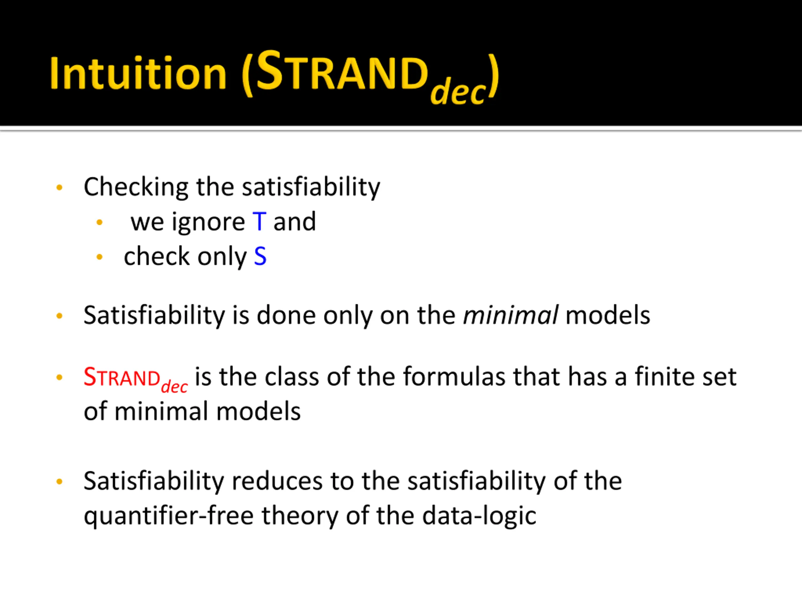 Checking the satisfiability we ignore T and check only S Satisfiability is done only on the minimal models STRANDdec is the class of the formulas that has a finite set of minimal models Satisfiability reduces to the satisfiability of the quantifier-free theory of the data-logic