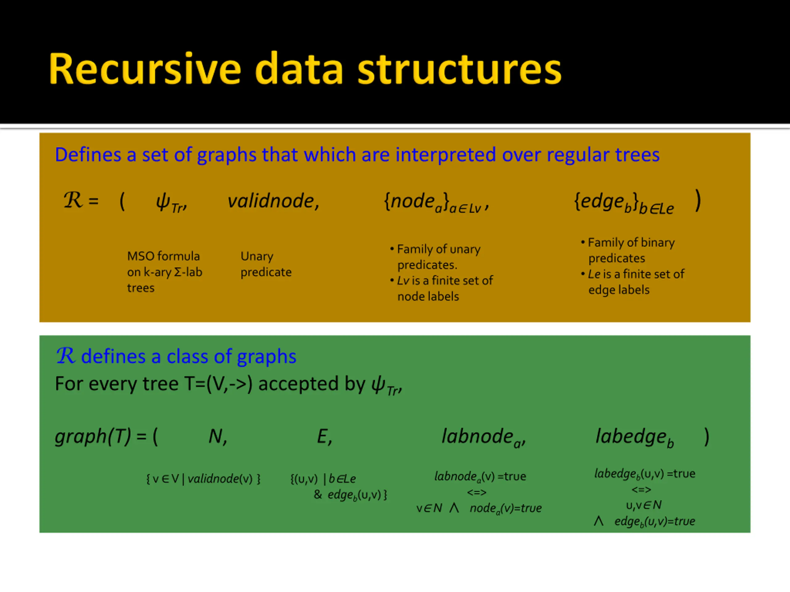 Defines a set of graphs that which are interpreted over regular trees R = ( Tr, validnode, {nodea}a Lv , {edgeb}b Le ) Family of binary predicates Le is a finite set of edge labels Family of unary predicates. Lv is a finite set of node labels MSO formula on k-ary -lab trees Unary predicate R defines a class of graphs For every tree T=(V,->) accepted by Tr, graph(T) = ( N, E, labnodea, labedgeb ) labedgeb(u,v) =true <=> u,v N edgeb(u,v)=true labnodea(v) =true <=> v N nodea(v)=true { v V | validnode(v)} {(u,v) | b Le & edgeb(u,v) }