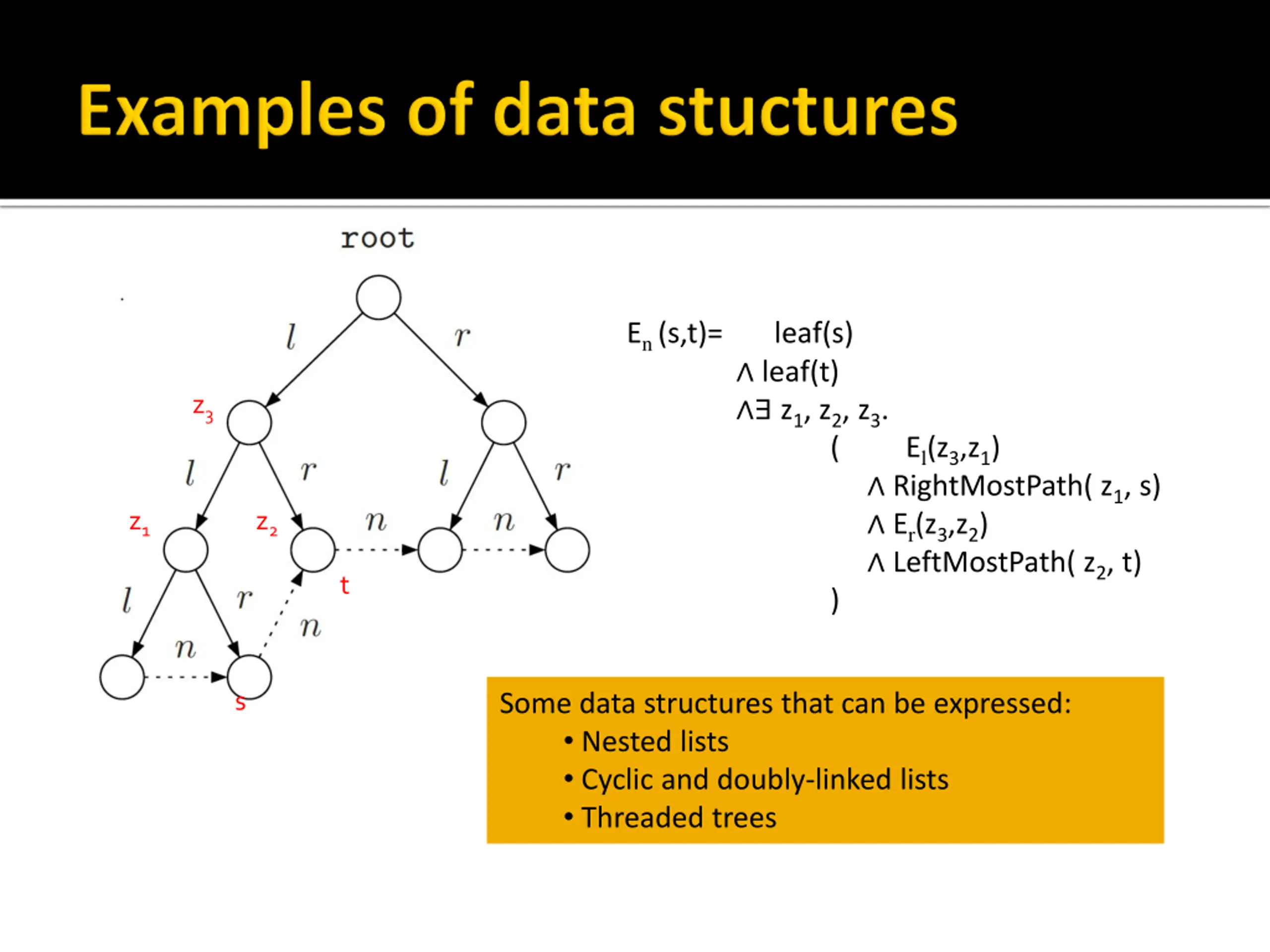 En (s,t)= leaf(s) leaf(t) z1, z2, z3. ( El(z3,z1) RightMostPath( z1, s) Er(z3,z2) LeftMostPath( z2, t) ) z3 z1 z2 t s Some data structures that can be expressed: Nested lists Cyclic and doubly-linked lists Threaded trees