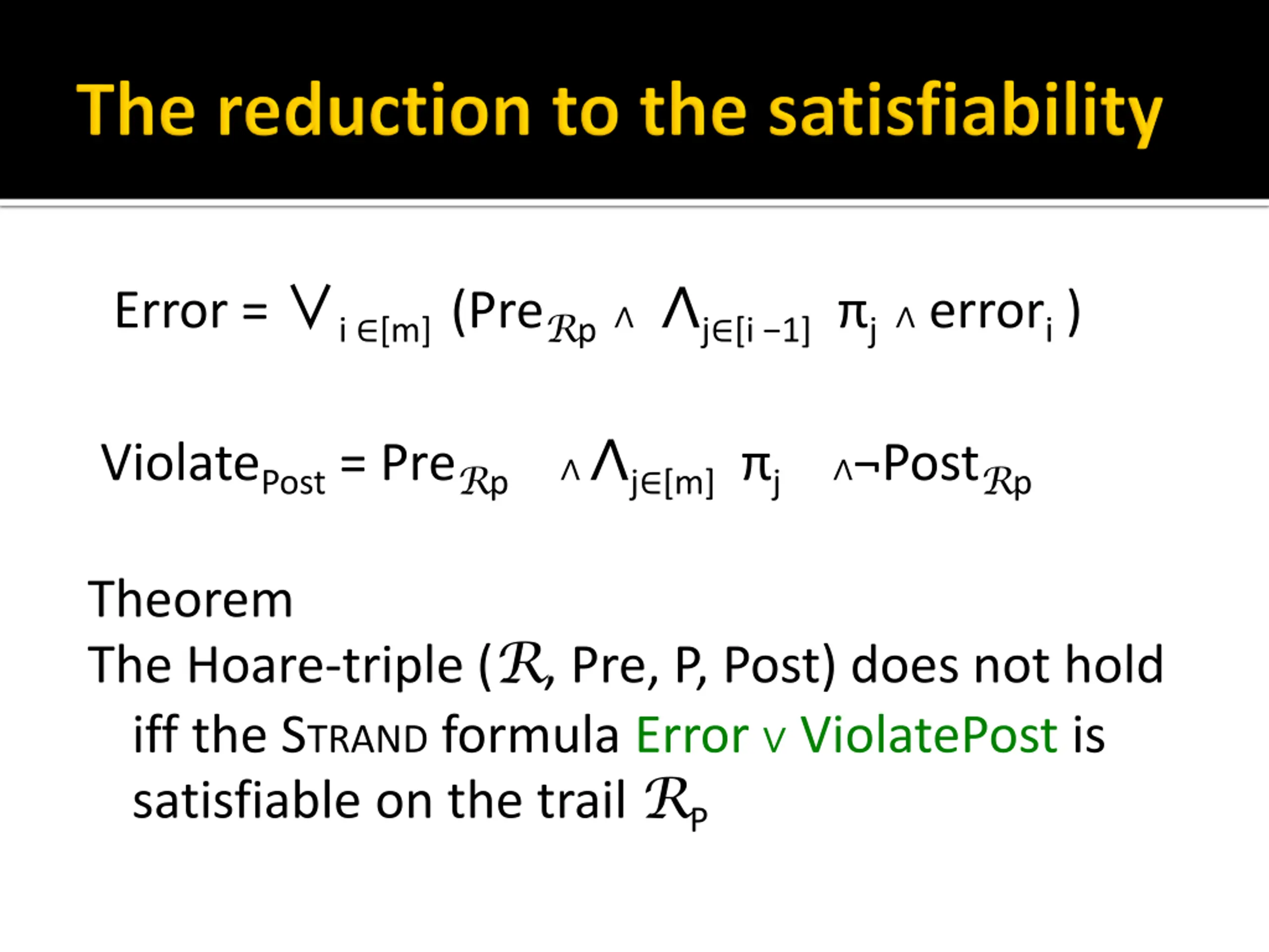Error = i [m](PreRp j[i 1]j errori ) ViolatePost = PreRp j [m] j PostRp Theorem The Hoare-triple (R, Pre, P, Post) does not hold iff the STRAND formula Error ViolatePost is satisfiable on the trail RP