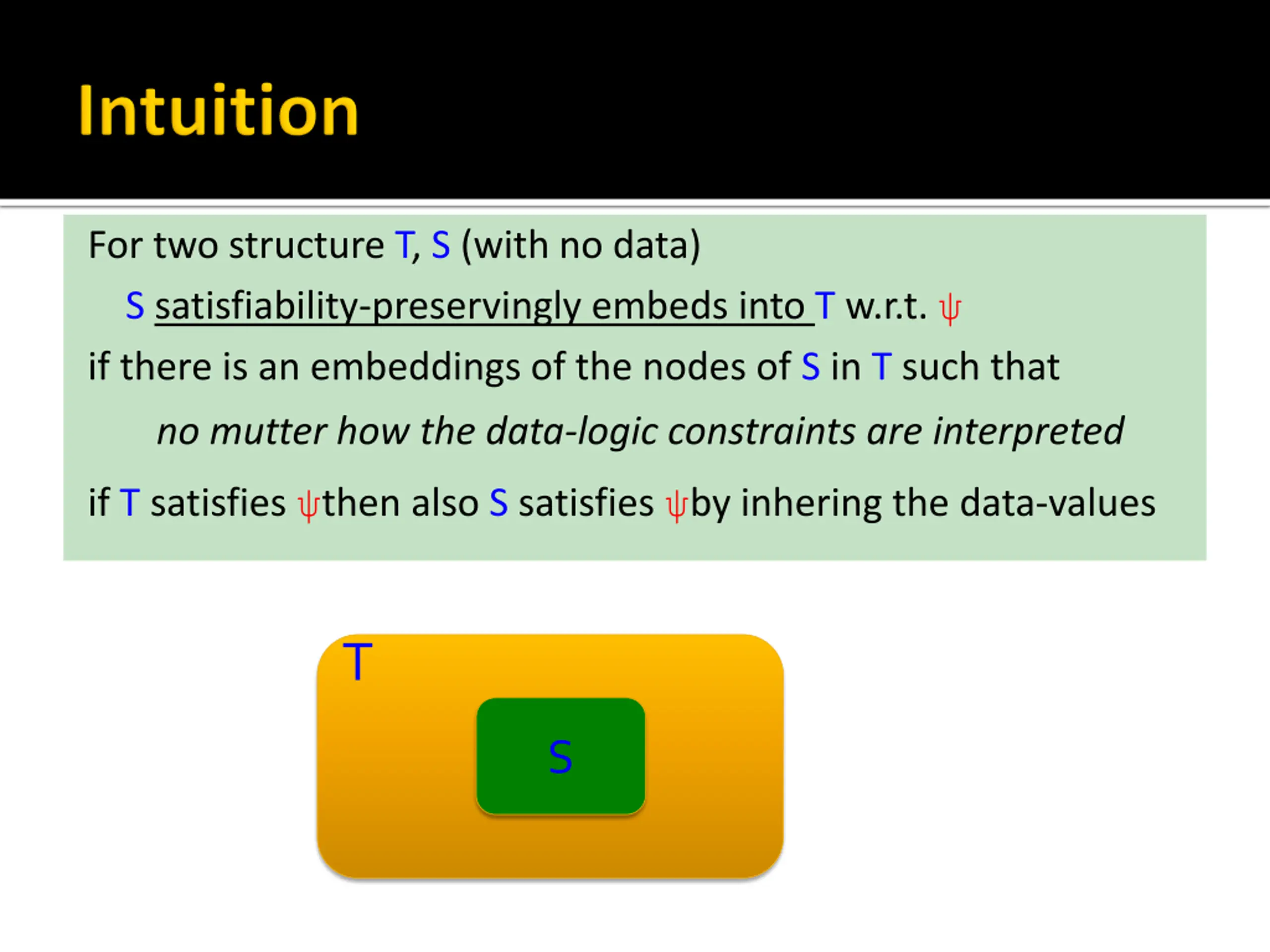 For two structure T, S (with no data) S satisfiability-preservingly embeds into T w.r.t. if there is an embeddings of the nodes of S in T such that no mutter how the data-logic constraints are interpreted if T satisfies then also S satisfies by inhering the data-values T S