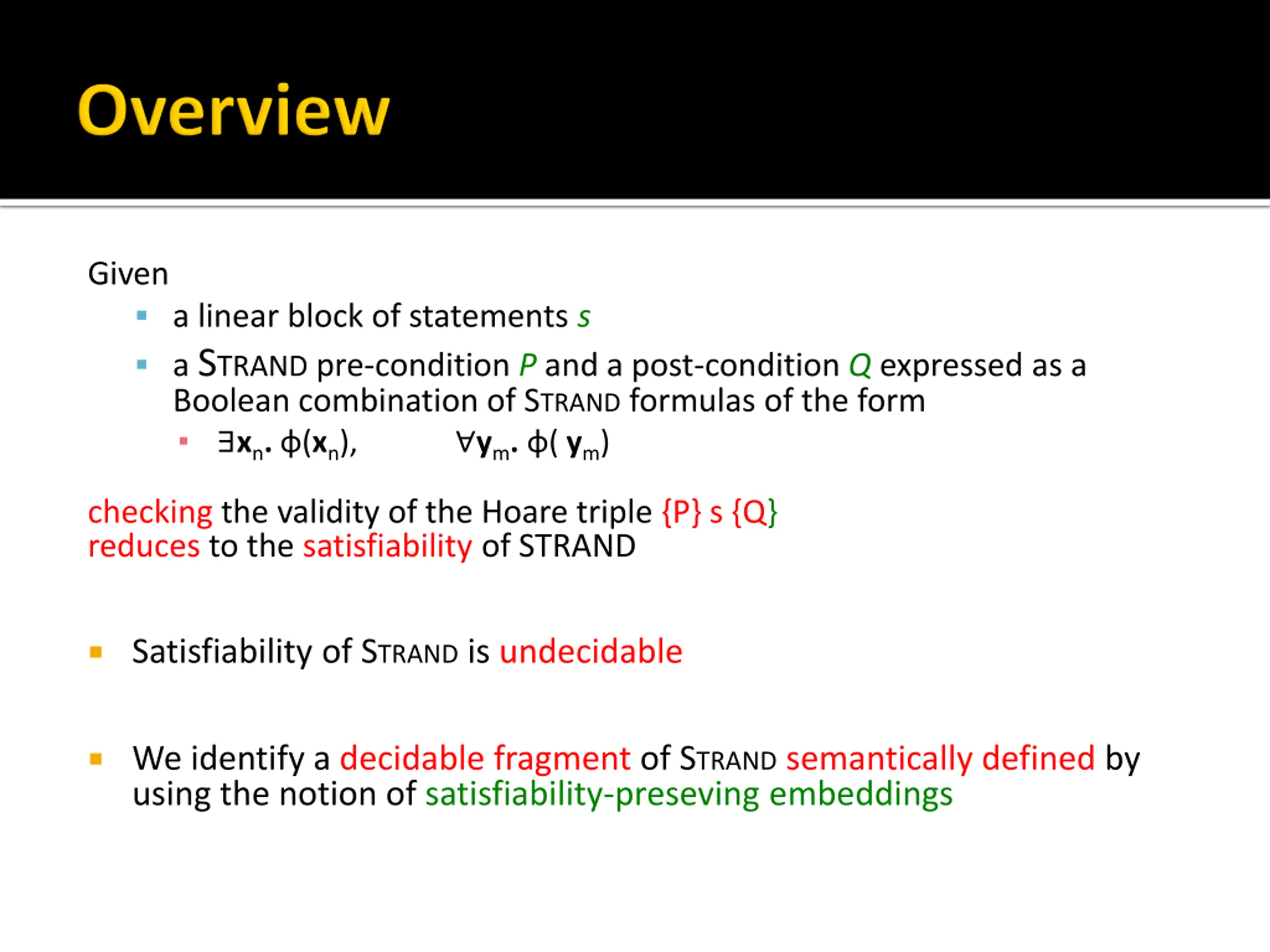 Given a linear block of statements s a STRAND pre-condition P and a post-condition Q expressed as a Boolean combination of STRAND formulas of the form xn. (xn), ym. ( ym) checking the validity of the Hoare triple {P} s {Q} reduces to the satisfiability of STRAND Satisfiability of STRAND is undecidable We identify a decidable fragment of STRAND semantically defined by using the notion of satisfiability-preseving embeddings