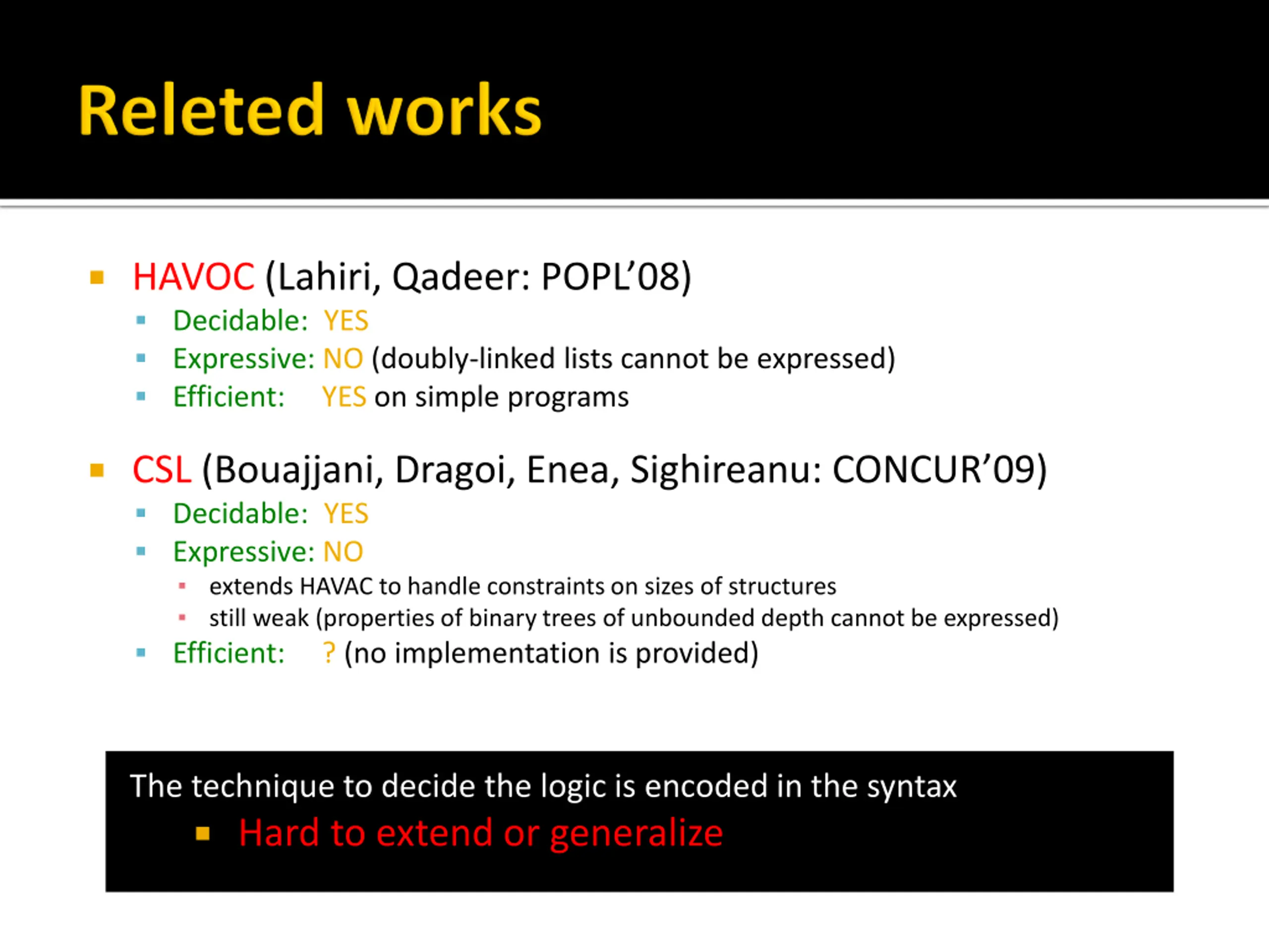 HAVOC (Lahiri, Qadeer: POPL08) Decidable: YES Expressive: NO (doubly-linked lists cannot be expressed) Efficient: YES on simple programs CSL (Bouajjani, Dragoi, Enea, Sighireanu: CONCUR 09) Decidable: YES Expressive: NO extends HAVAC to handle constraints on sizes of structures still weak (properties of binary trees of unbounded depth cannot be expressed) Efficient: ? (no implementation is provided) The technique to decide the logic is encoded in the syntax Hard to extend or generalize