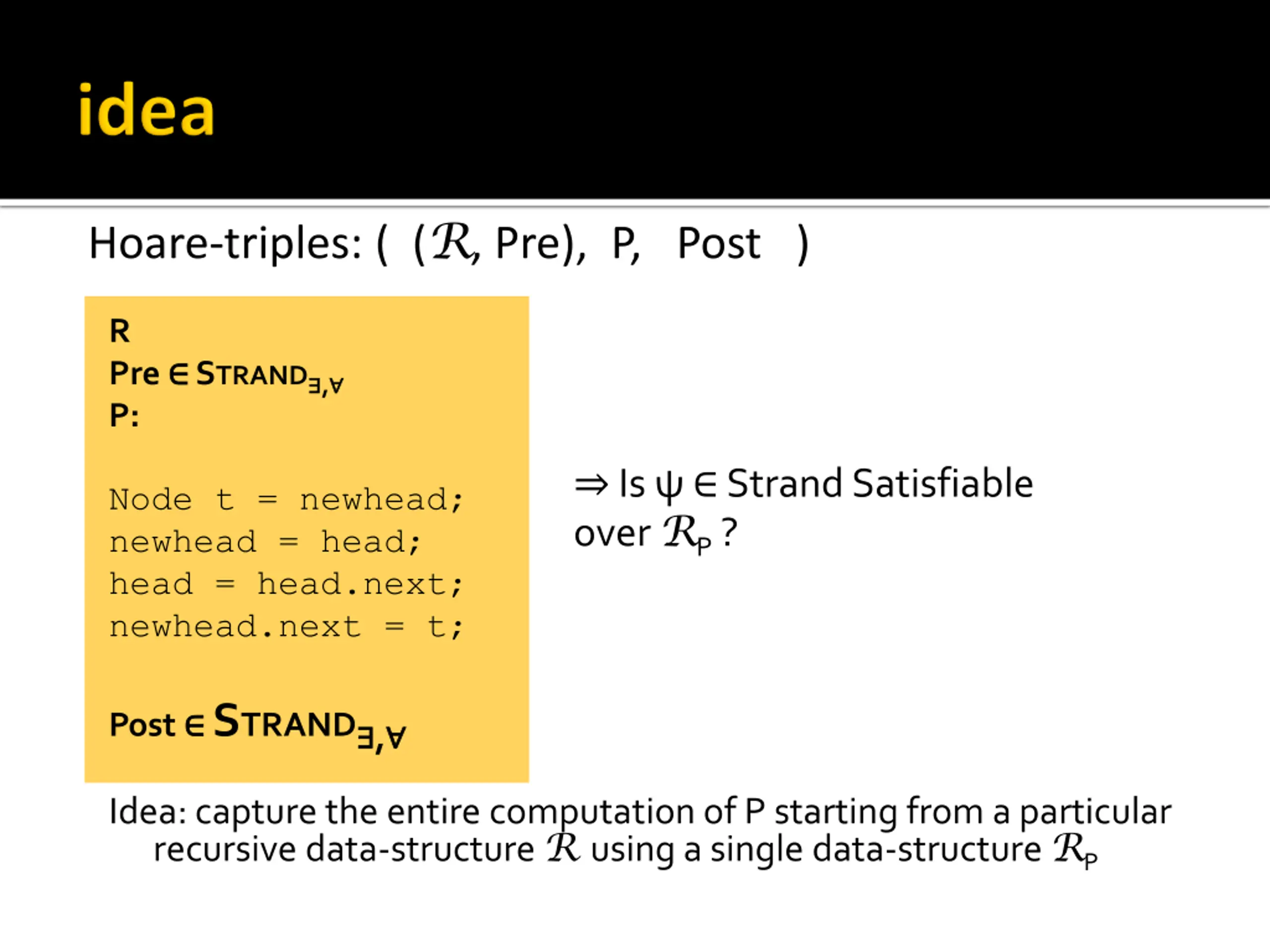 Hoare-triples: ( (R, Pre), P, Post ) R Pre STRAND , P: Is Strand Satisfiable over RP ? Node t = newhead; newhead = head; head = head.next; newhead.next = t; Post STRAND , Idea: capture the entire computation of P starting from a particular recursive data-structure R using a single data-structure RP