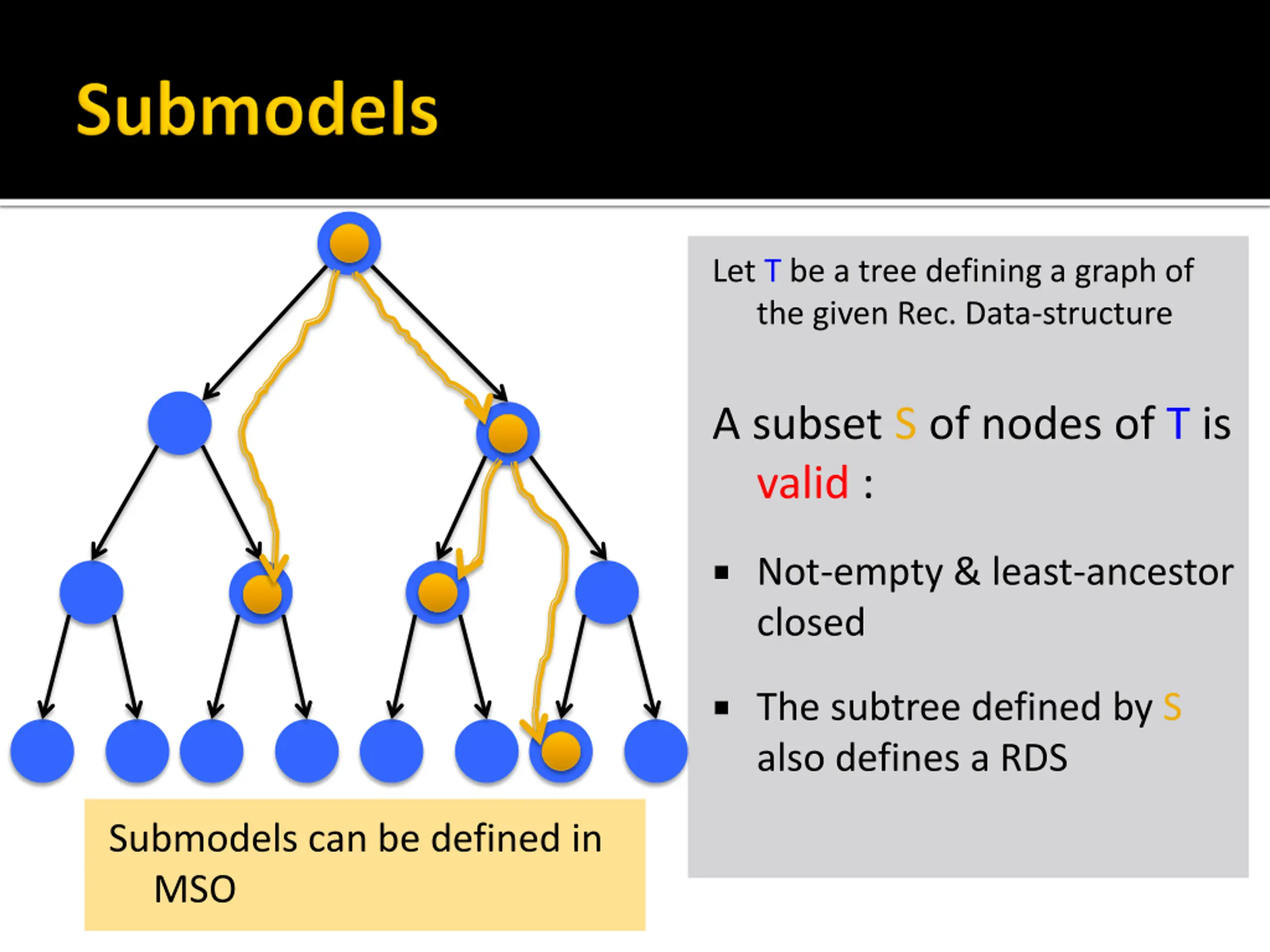 Let T be a tree defining a graph of the given Rec. Data-structure A subset S of nodes of T is valid : Not-empty & least-ancestor closed The subtree defined by S also defines a RDS Submodels can be defined in MSO
