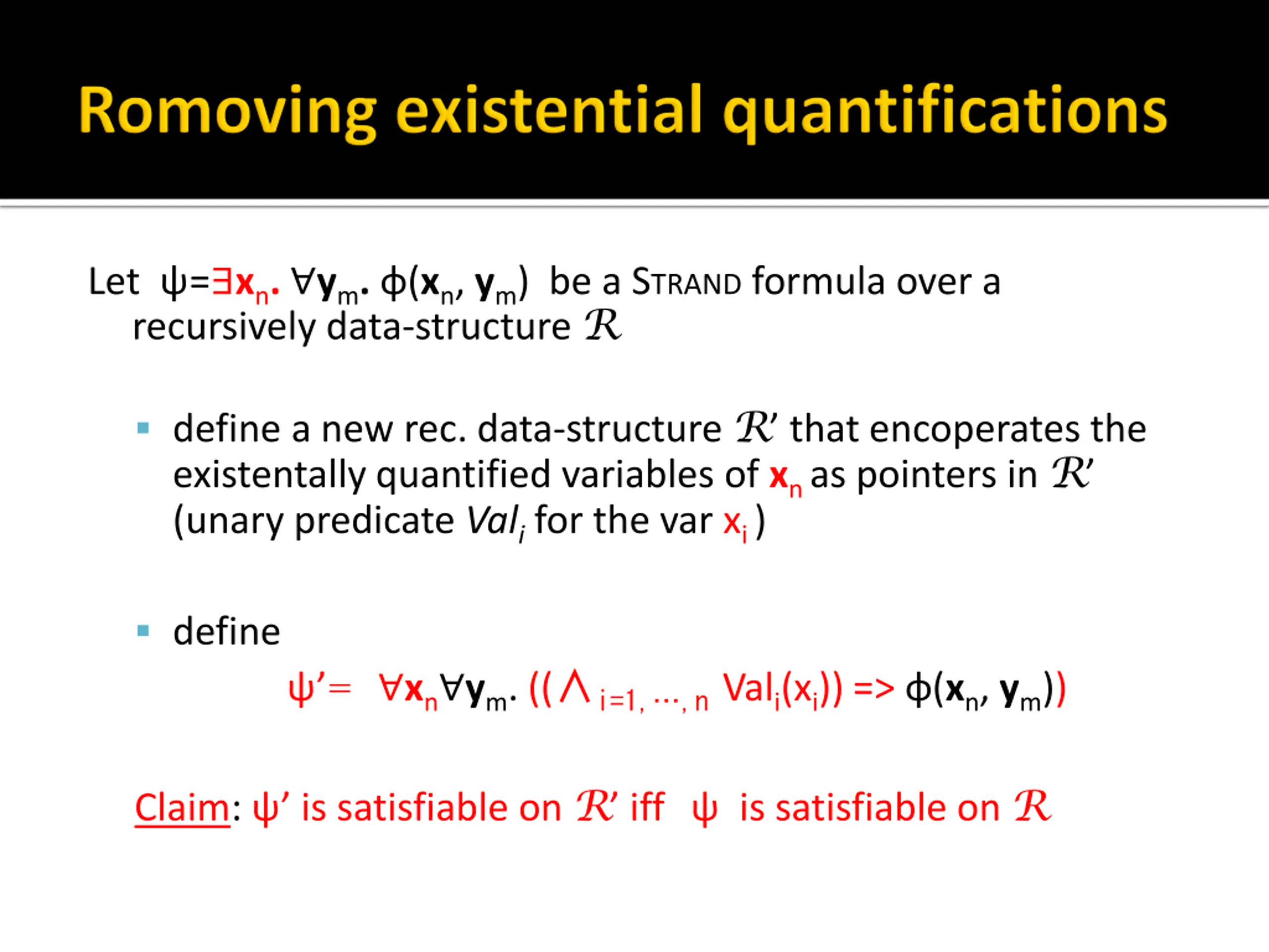 Let =xn.ym.(xn, ym) be a STRAND formula over a recursively data-structure R define a new rec. data-structure R that encoperates the existentally quantified variables of xn as pointers in R (unary predicate Vali for the var xi ) define = xn ym. (( i=1, ,n Vali(xi)) => (xn, ym)) Claim: is satisfiable on R iff is satisfiable on R