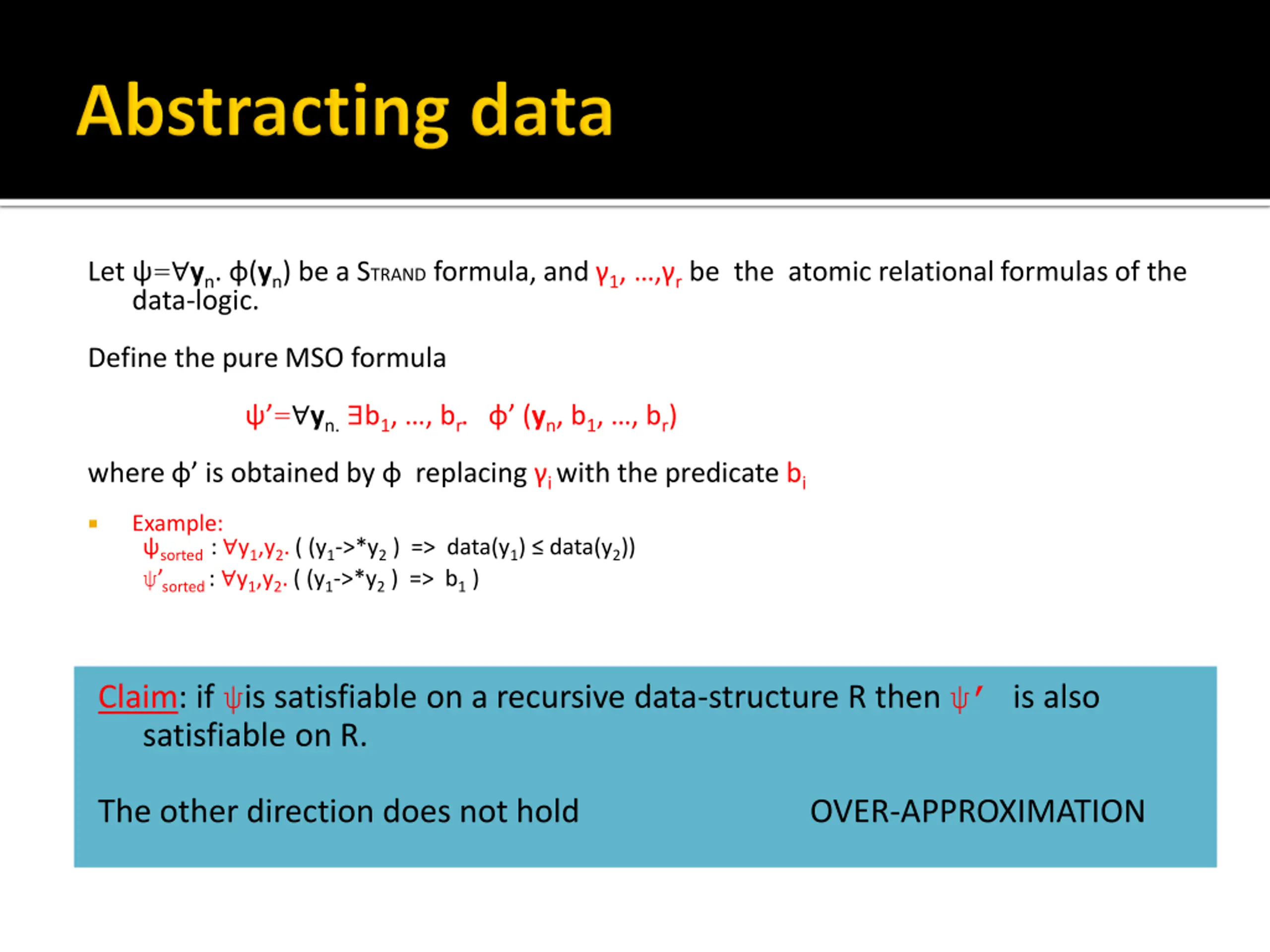 Let =yn. (yn) be a STRAND formula, and 1, ,r be the atomic relational formulas of the data-logic. Define the pure MSO formula = yn. b1, , br. (yn,b1, , br) where is obtained by replacing i with the predicate bi Example: sorted : y1,y2. ( (y1->*y2 ) => data(y1) data(y2)) sorted : y1,y2. ( (y1->*y2 ) => b1 ) Claim: if is satisfiable on a recursive data-structure R then is also satisfiable on R. The other direction does not hold OVER-APPROXIMATION
