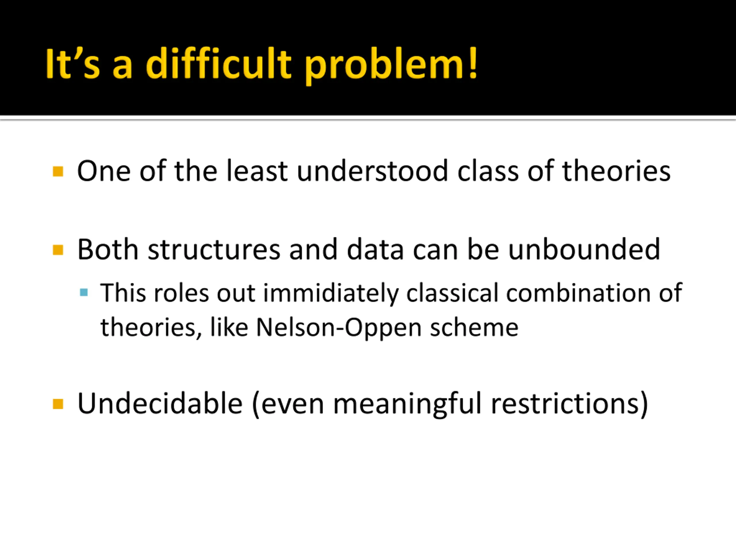 One of the least understood class of theories Both structures and data can be unbounded This roles out immidiately classical combination of theories, like Nelson-Oppen scheme Undecidable (even meaningful restrictions)
