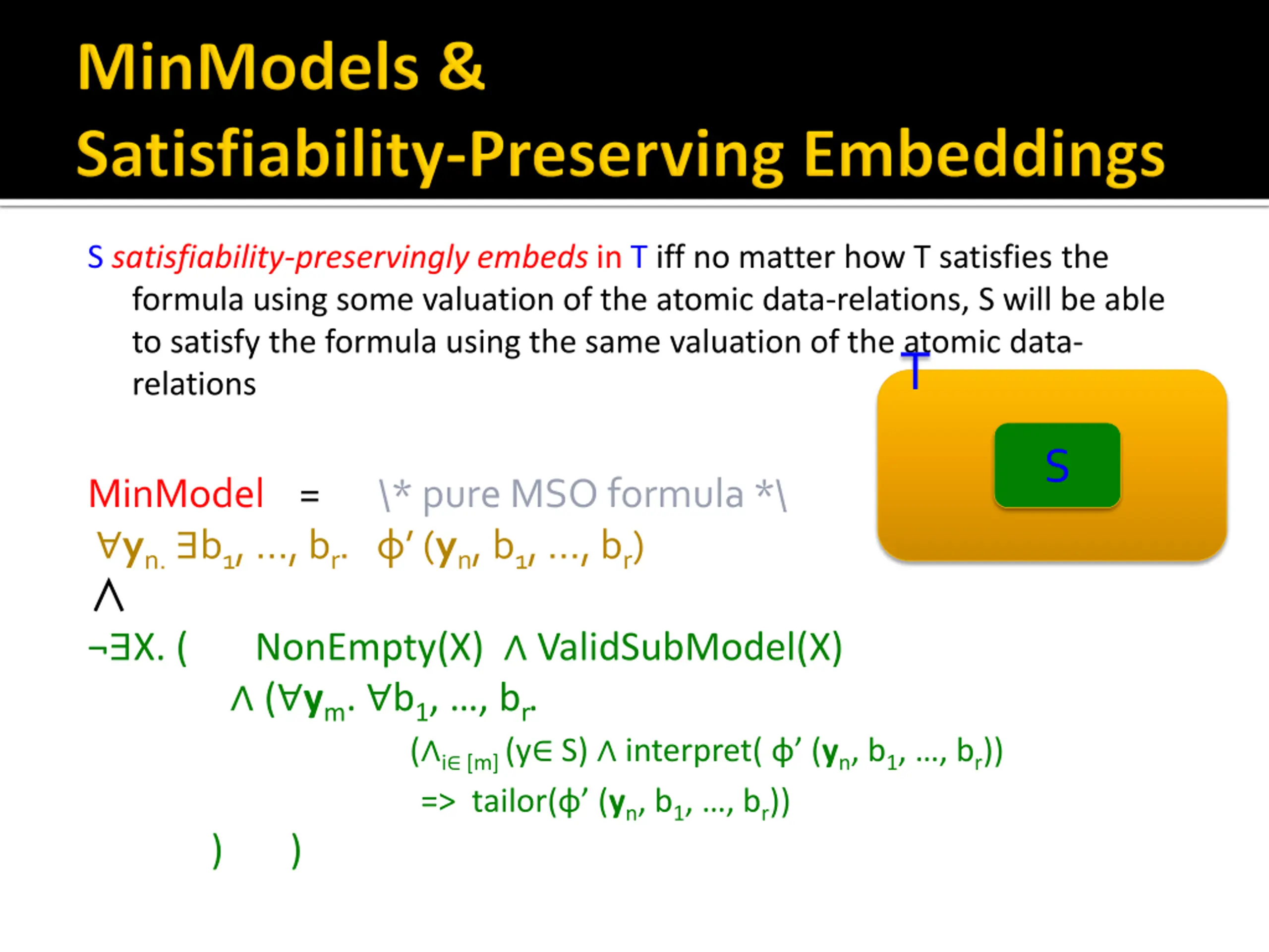 S satisfiability-preservingly embeds in T iff no matter how T satisfies the formula using some valuation of the atomic data-relations, S will be able to satisfy the formula using the same valuation of the atomic data- relations T S MinModel = \* pure MSO formula *\ yn. b1, , br. (yn,b1, , br) X. ( NonEmpty(X) ValidSubModel(X) ( ym. b1, , br. ( i [m] (y S) interpret( (yn,b1, , br)) => tailor( (yn,b1, , br)) ) )