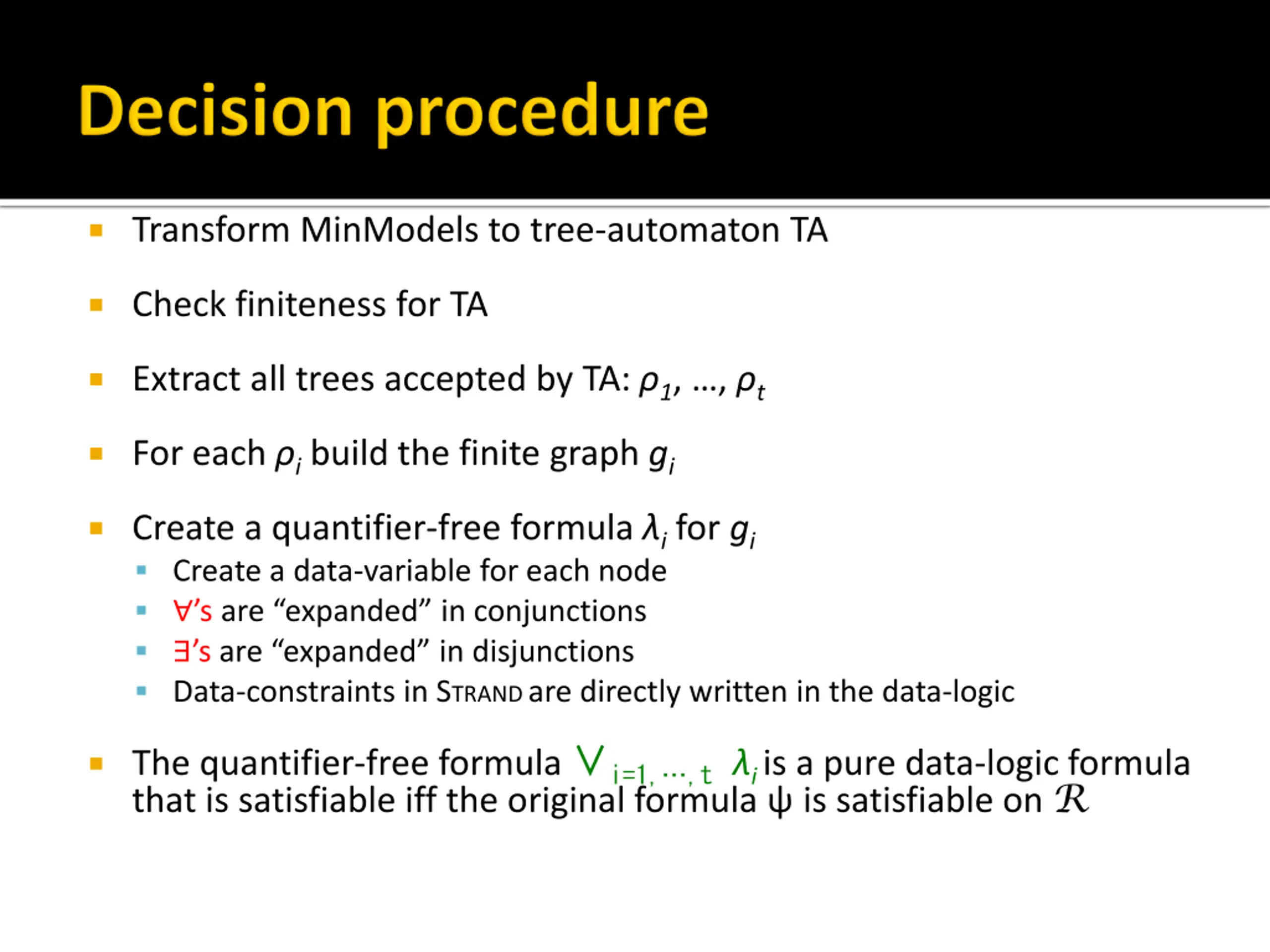 Transform MinModels to tree-automaton TA Check finiteness for TA Extract all trees accepted by TA: 1, , t For each i build the finite graph gi Create a quantifier-free formula i for gi Create a data-variable for each node sare expanded in conjunctions sare expanded in disjunctions Data-constraints in STRAND are directly written in the data-logic The quantifier-free formula i=1, ,t i is a pure data-logic formula that is satisfiable iff the original formula is satisfiable on R