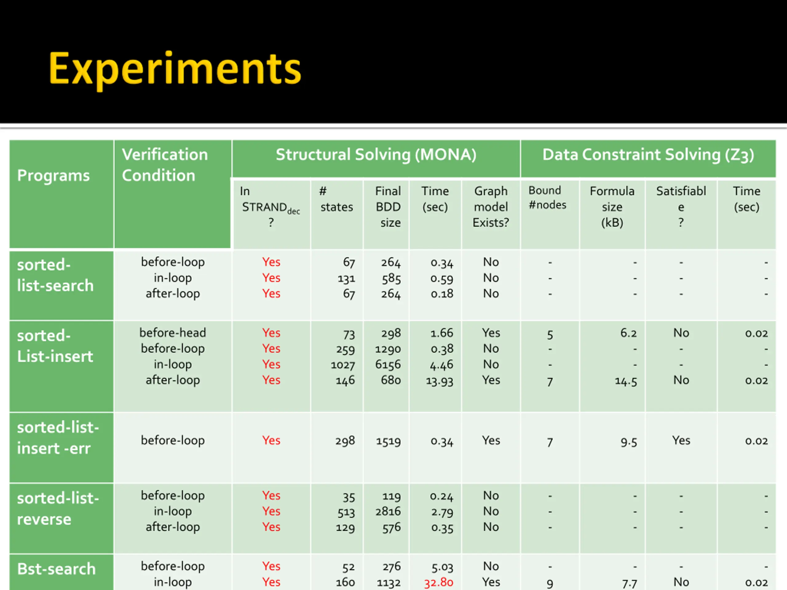 Verification Condition Structural Solving (MONA) Data Constraint Solving (Z3) Programs Bound #nodes In STRANDdec ? # states Final BDD size Time (sec) Graph model Exists? Formula size (kB) Satisfiabl e ? Time (sec) before-loop in-loop after-loop Yes Yes Yes 67 131 67 264 585 264 0.34 0.59 0.18 No No No - - - - - - - - - - - - sorted- list-search before-head before-loop in-loop after-loop Yes Yes Yes Yes 73 298 1290 6156 680 1.66 0.38 4.46 13.93 Yes No No Yes 5 - - 7 6.2 No - - No 0.02 sorted- List-insert 259 1027 146 - - - - 14.5 0.02 sorted-list- insert -err before-loop Yes 298 1519 0.34 Yes 7 9.5 Yes 0.02 before-loop in-loop after-loop Yes Yes Yes 35 513 129 119 2816 576 0.24 2.79 0.35 No No No - - - - - - - - - - - - sorted-list- reverse before-loop in-loop Yes Yes 52 160 276 1132 5.03 32.80 No Yes - 9 - - - Bst-search 7.7 N0 0.02