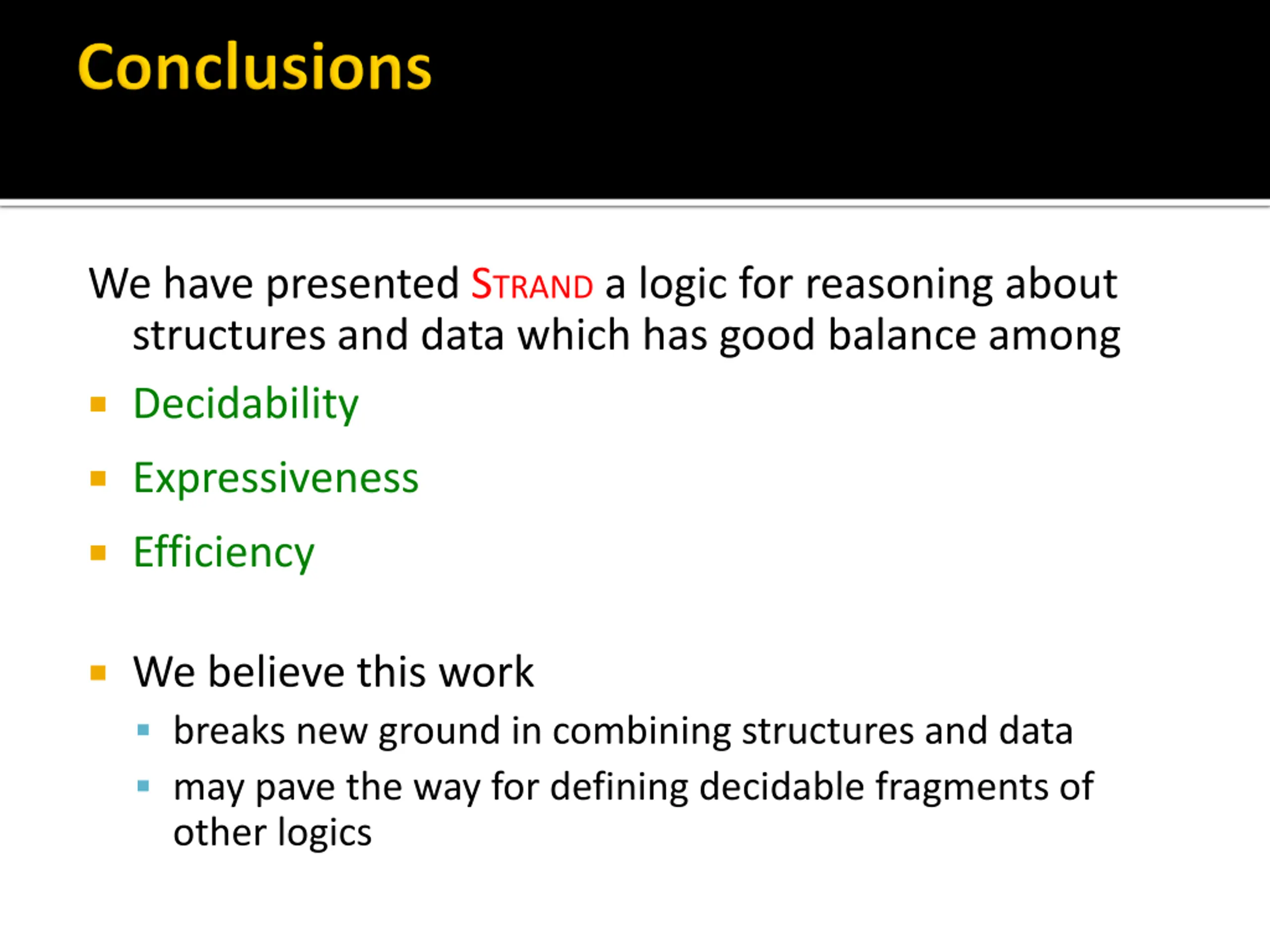 We have presented STRAND a logic for reasoning about structures and data which has good balance among Decidability Expressiveness Efficiency We believe this work breaks new ground in combining structures and data may pave the way for defining decidable fragments of other logics