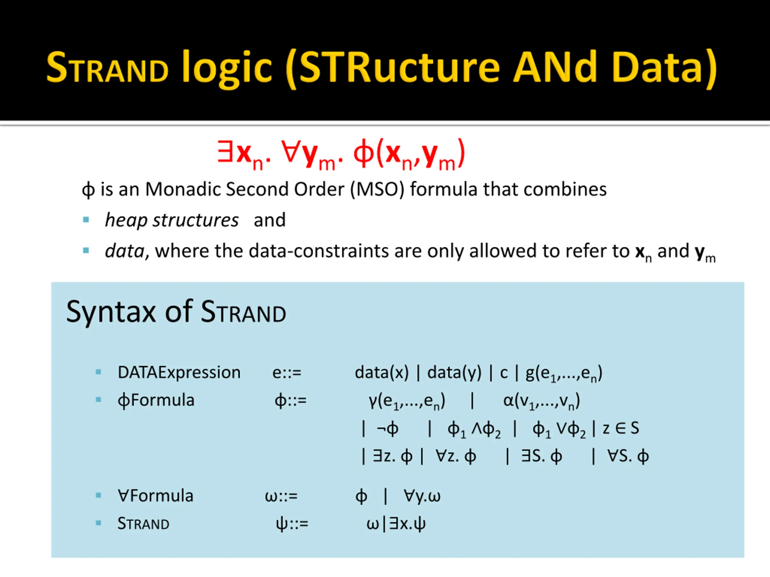 xn. ym. (xn,ym) is an Monadic Second Order (MSO) formula that combines heap structures and data, where the data-constraints are only allowed to refer to xnand ym Syntax of STRAND DATAExpression e::= data(x) | data(y) | c | g(e1,...,en) Formula ::= (e1,...,en) | (v1,...,vn) | | 1 2| 1 2 | z S | z. | z. | S. | S. Formula ::= | y. STRAND ::= | x.