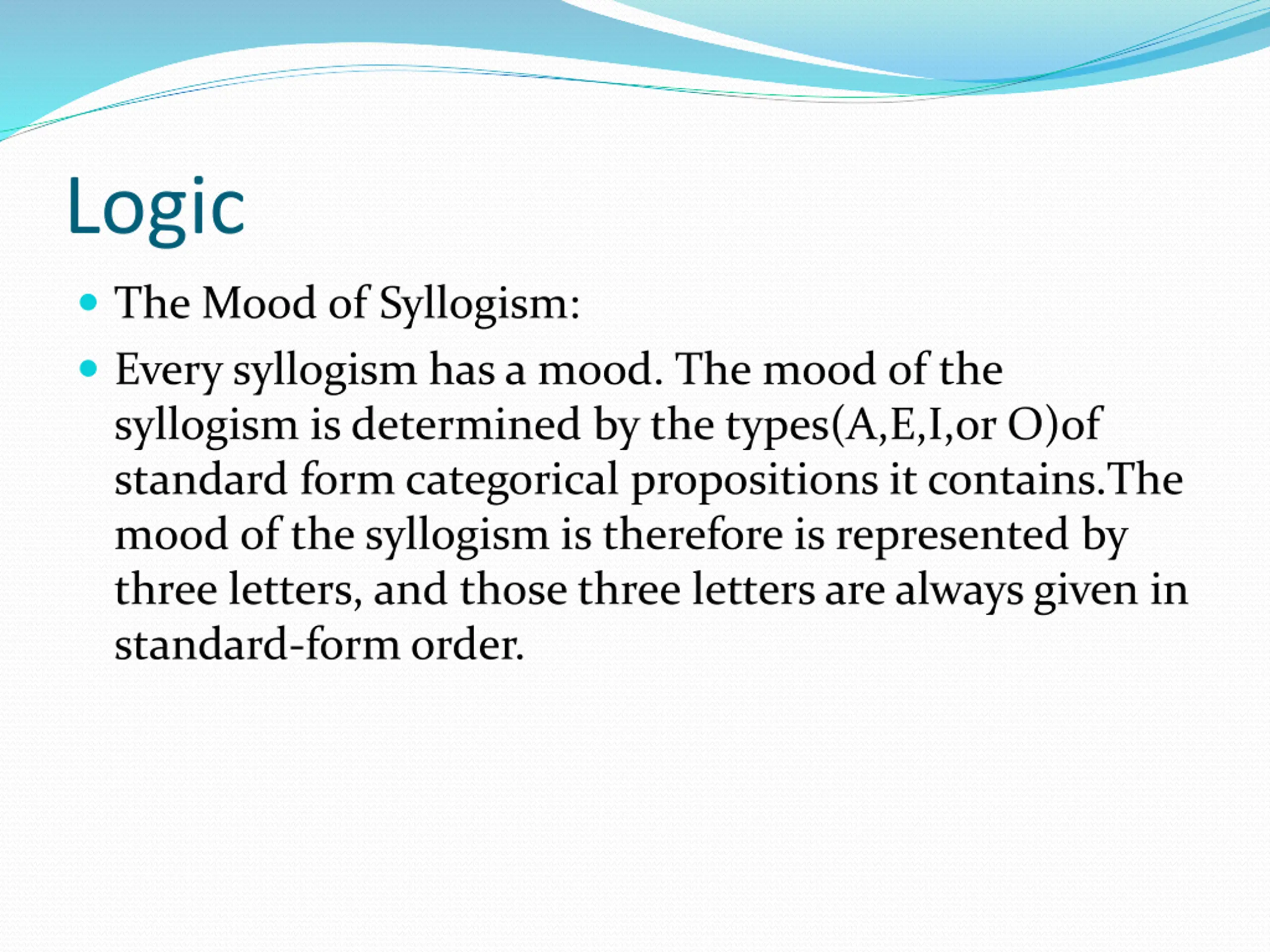 Logic The Mood of Syllogism: Every syllogism has a mood. The mood of the syllogism is determined by the types(A,E,I,or O)of standard form categorical propositions it contains.The mood of the syllogism is therefore is represented by three letters, and those three letters are always given in standard-form order.