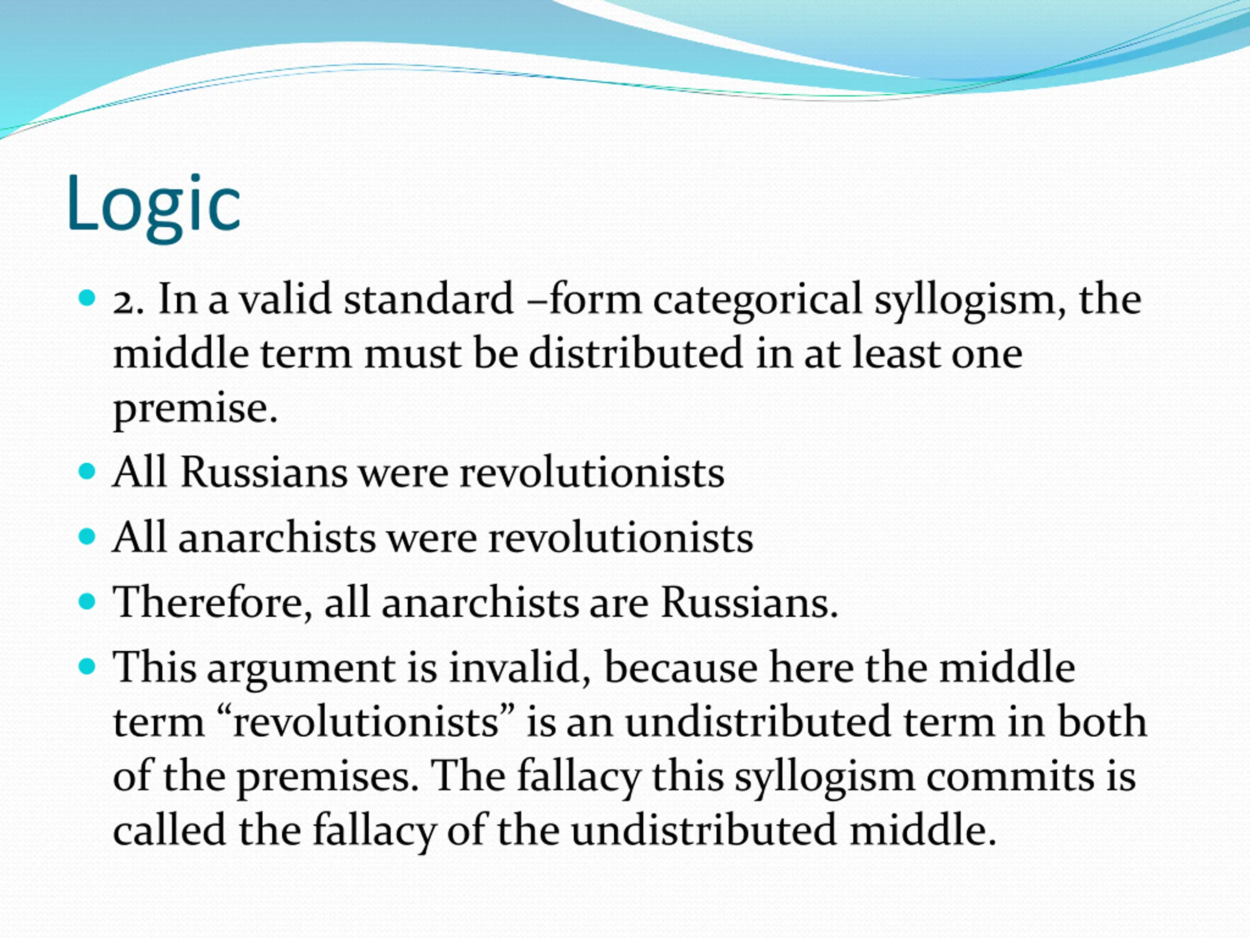 Logic 2. In a valid standard form categorical syllogism, the middle term must be distributed in at least one premise. All Russians were revolutionists All anarchists were revolutionists Therefore, all anarchists are Russians. This argument is invalid, because here the middle term revolutionists is an undistributed term in both of the premises. The fallacy this syllogism commits is called the fallacy of the undistributed middle.