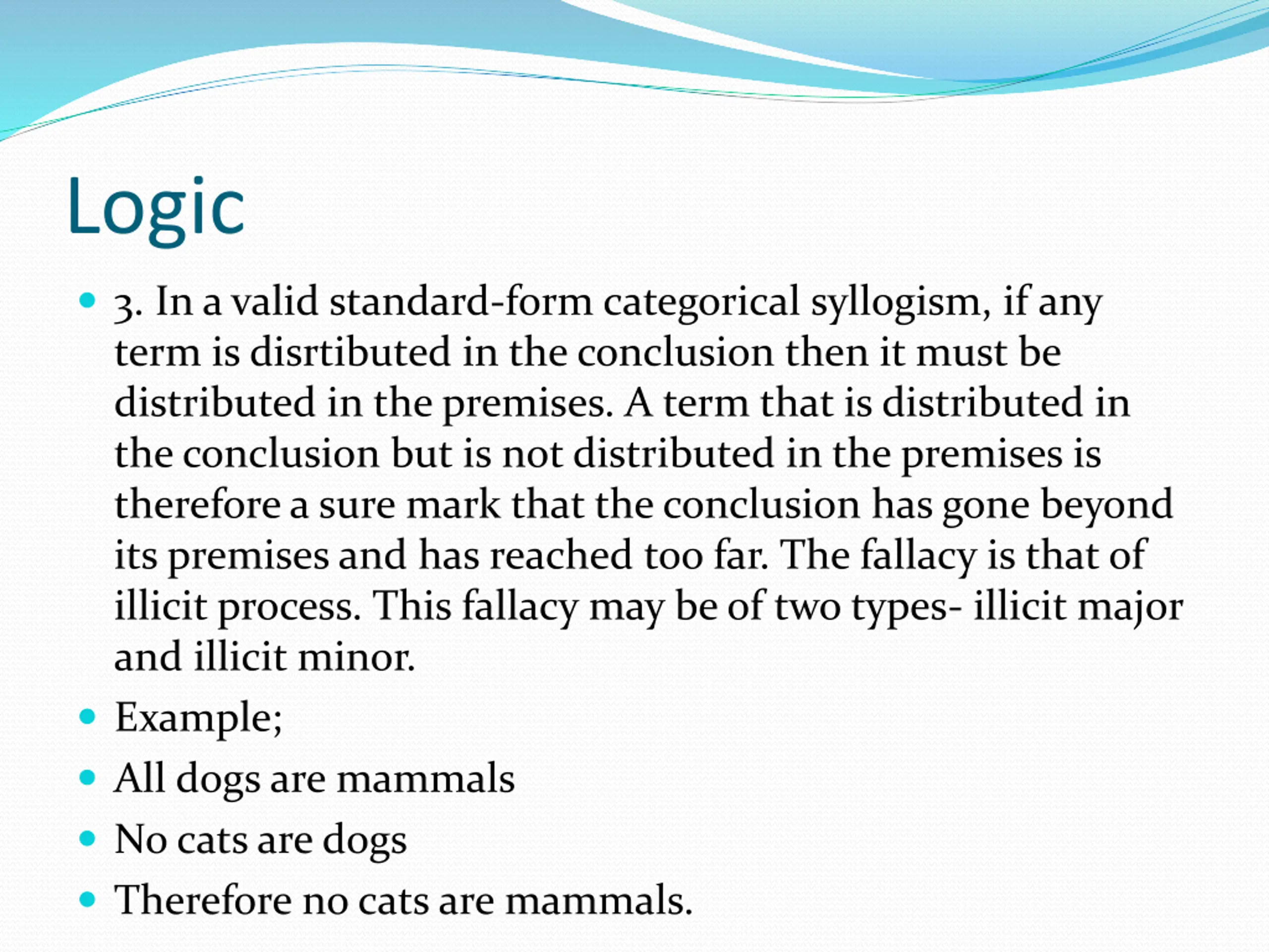 Logic 3. In a valid standard-form categorical syllogism, if any term is disrtibuted in the conclusion then it must be distributed in the premises. A term that is distributed in the conclusion but is not distributed in the premises is therefore a sure mark that the conclusion has gone beyond its premises and has reached too far. The fallacy is that of illicit process. This fallacy may be of two types- illicit major and illicit minor. Example; All dogs are mammals No cats are dogs Therefore no cats are mammals.