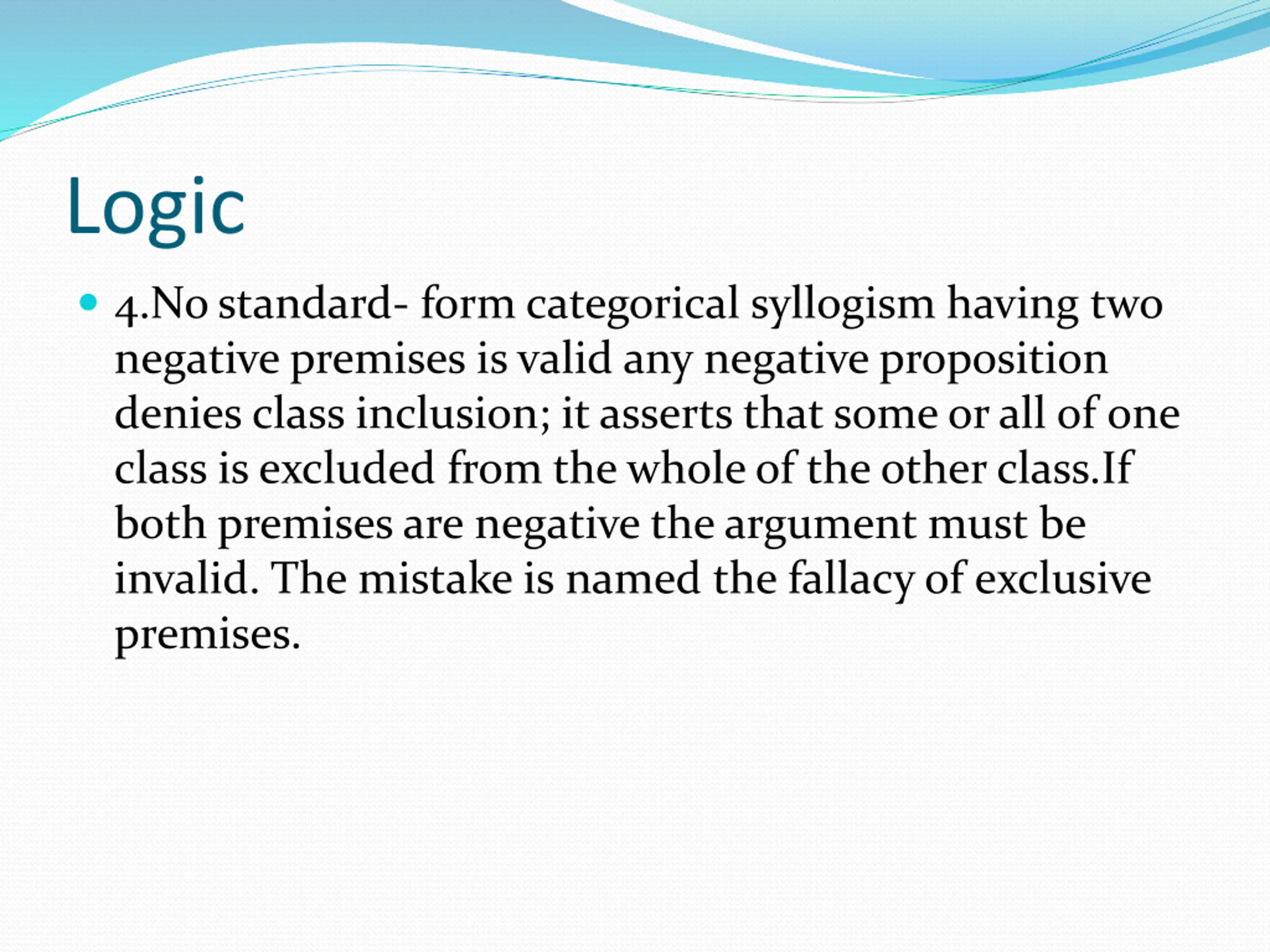 Logic 4.No standard- form categorical syllogism having two negative premises is valid any negative proposition denies class inclusion; it asserts that some or all of one class is excluded from the whole of the other class.If both premises are negative the argument must be invalid. The mistake is named the fallacy of exclusive premises.
