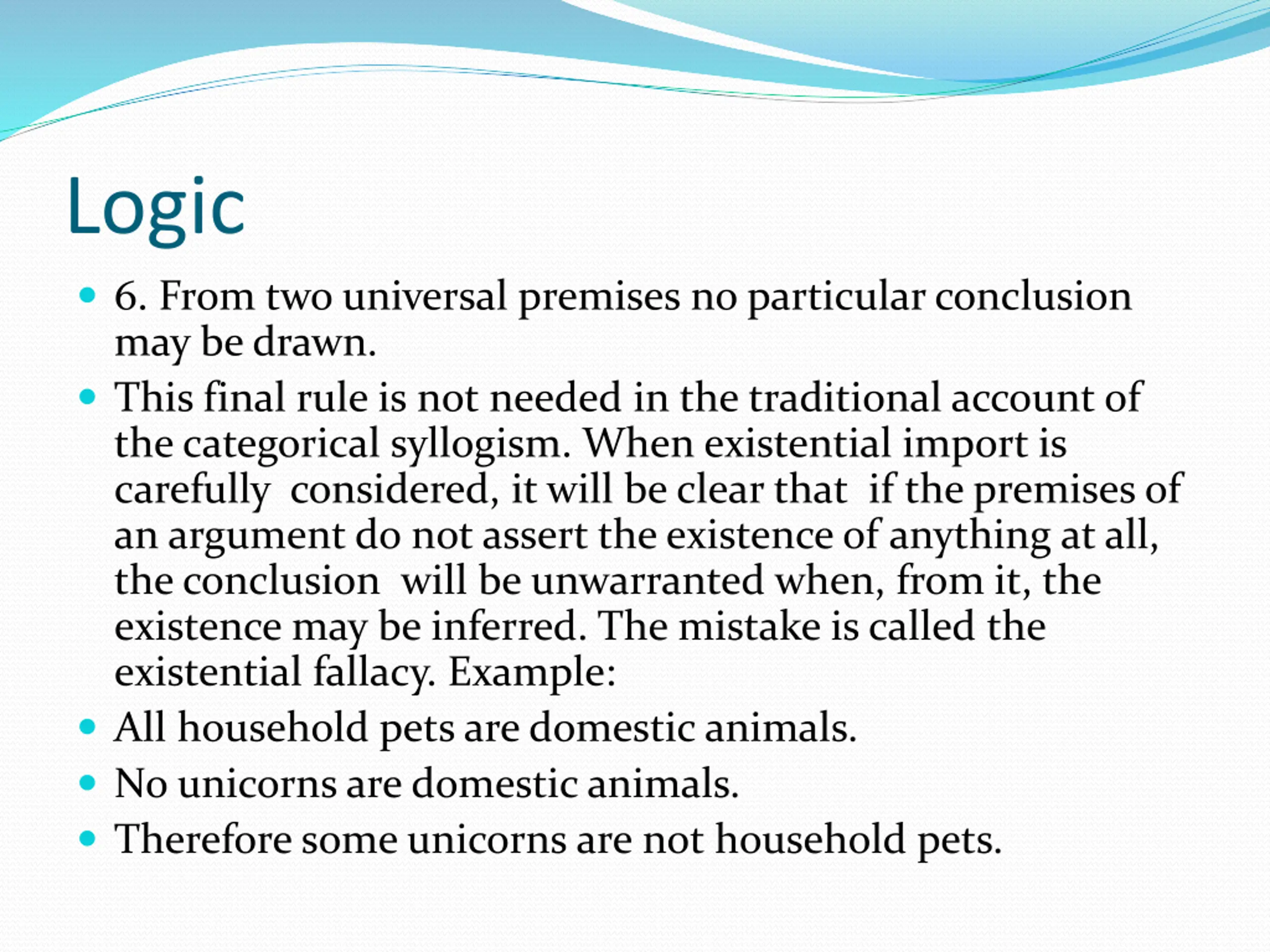 Logic 6. From two universal premises no particular conclusion may be drawn. This final rule is not needed in the traditional account of the categorical syllogism. When existential import is carefully considered, it will be clear that if the premises of an argument do not assert the existence of anything at all, the conclusion will be unwarranted when, from it, the existence may be inferred. The mistake is called the existential fallacy. Example: All household pets are domestic animals. No unicorns are domestic animals. Therefore some unicorns are not household pets.