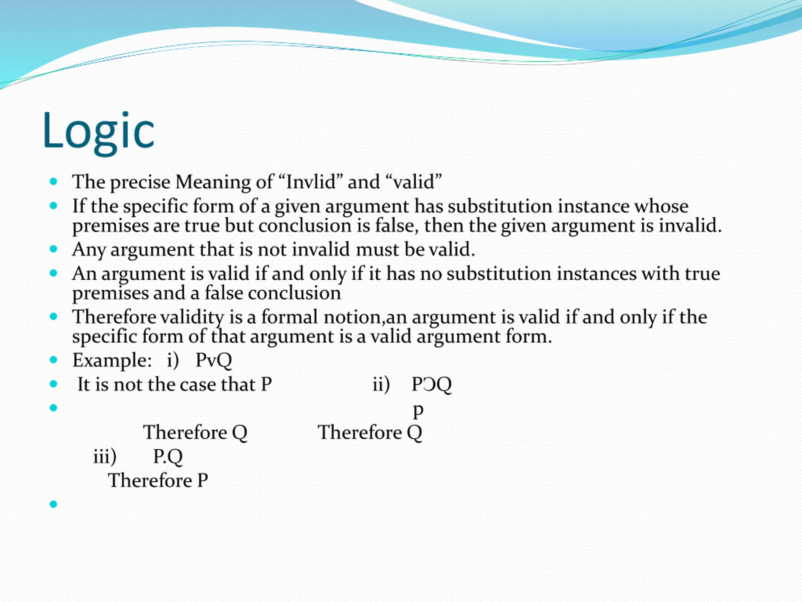 Logic The precise Meaning of Invlid and valid If the specific form of a given argument has substitution instance whose premises are true but conclusion is false, then the given argument is invalid. Any argument that is not invalid must be valid. An argument is valid if and only if it has no substitution instances with true premises and a false conclusion Therefore validity is a formal notion,an argument is valid if and only if the specific form of that argument is a valid argument form. Example: i) PvQ It is not the case that P ii) P Q Therefore Q Therefore Q iii) P.Q Therefore P p