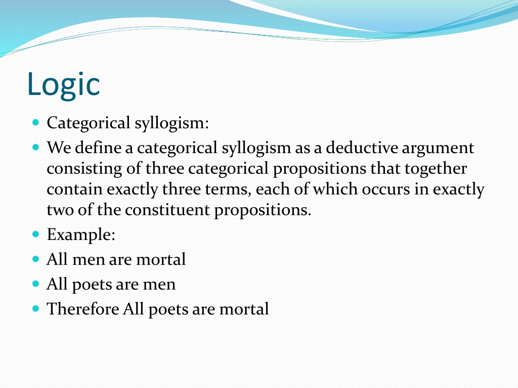 Logic Categorical syllogism: We define a categorical syllogism as a deductive argument consisting of three categorical propositions that together contain exactly three terms, each of which occurs in exactly two of the constituent propositions. Example: All men are mortal All poets are men Therefore All poets are mortal
