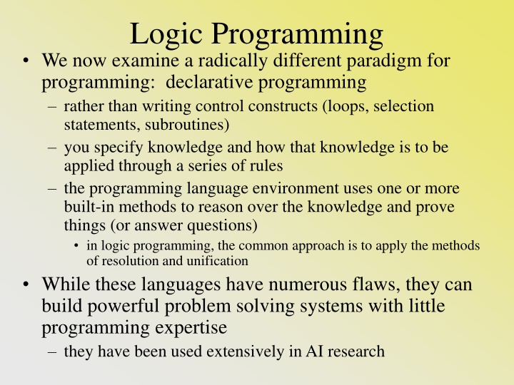 Logic Programming We now examine a radically different paradigm for programming: declarative programming rather than writing control constructs (loops, selection statements, subroutines) you specify knowledge and how that knowledge is to be applied through a series of rules the programming language environment uses one or more built-in methods to reason over the knowledge and prove things (or answer questions) in logic programming, the common approach is to apply the methods of resolution and unification While these languages have numerous flaws, they can build powerful problem solving systems with little programming expertise they have been used extensively in AI research