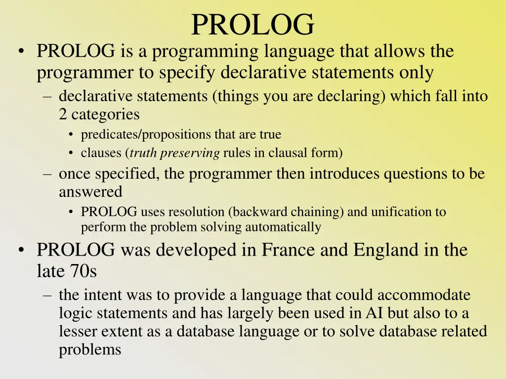 PROLOG PROLOG is a programming language that allows the programmer to specify declarative statements only declarative statements (things you are declaring) which fall into 2 categories predicates/propositions that are true clauses (truth preserving rules in clausal form) once specified, the programmer then introduces questions to be answered PROLOG uses resolution (backward chaining) and unification to perform the problem solving automatically PROLOG was developed in France and England in the late 70s the intent was to provide a language that could accommodate logic statements and has largely been used in AI but also to a lesser extent as a database language or to solve database related problems