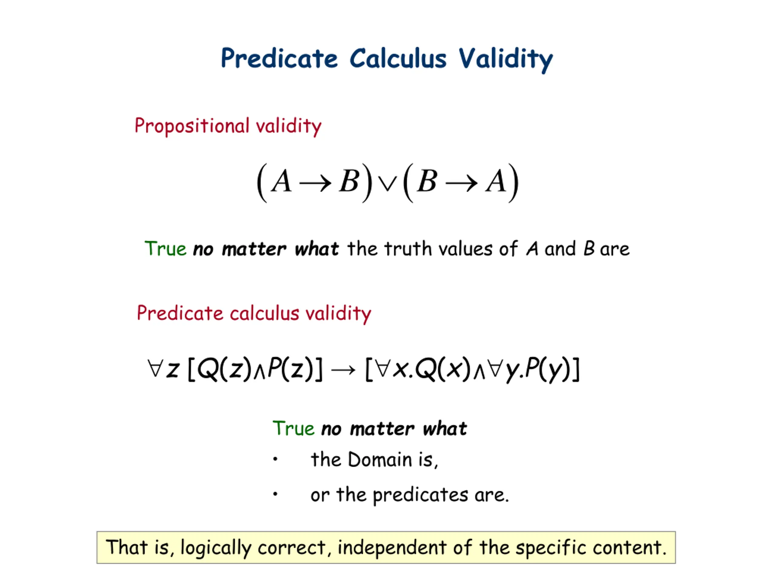 Predicate Calculus Validity Propositional validity ( ) ( ) A B B A True no matter what the truth values of A and B are Predicate calculus validity z [Q(z) P(z)] [ x.Q(x) y.P(y)] V V True no matter what the Domain is, or the predicates are. That is, logically correct, independent of the specific content.