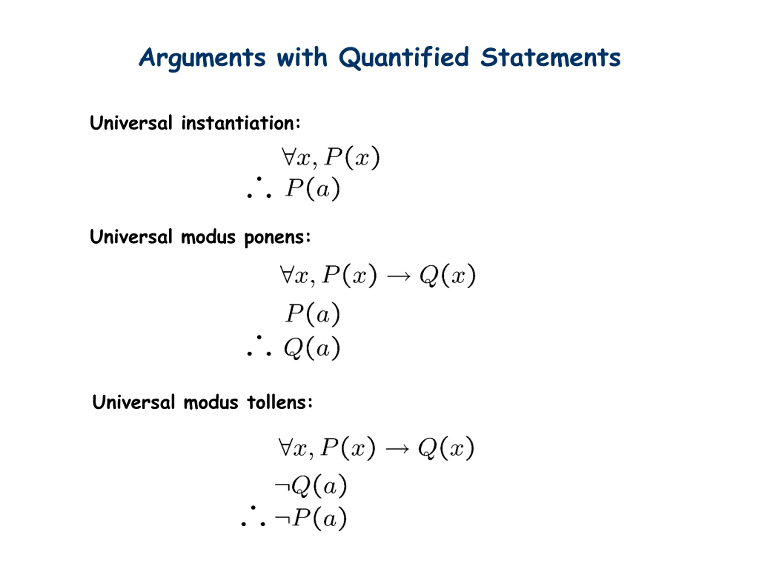 Arguments with Quantified Statements Universal instantiation: Universal modus ponens: Universal modus tollens:
