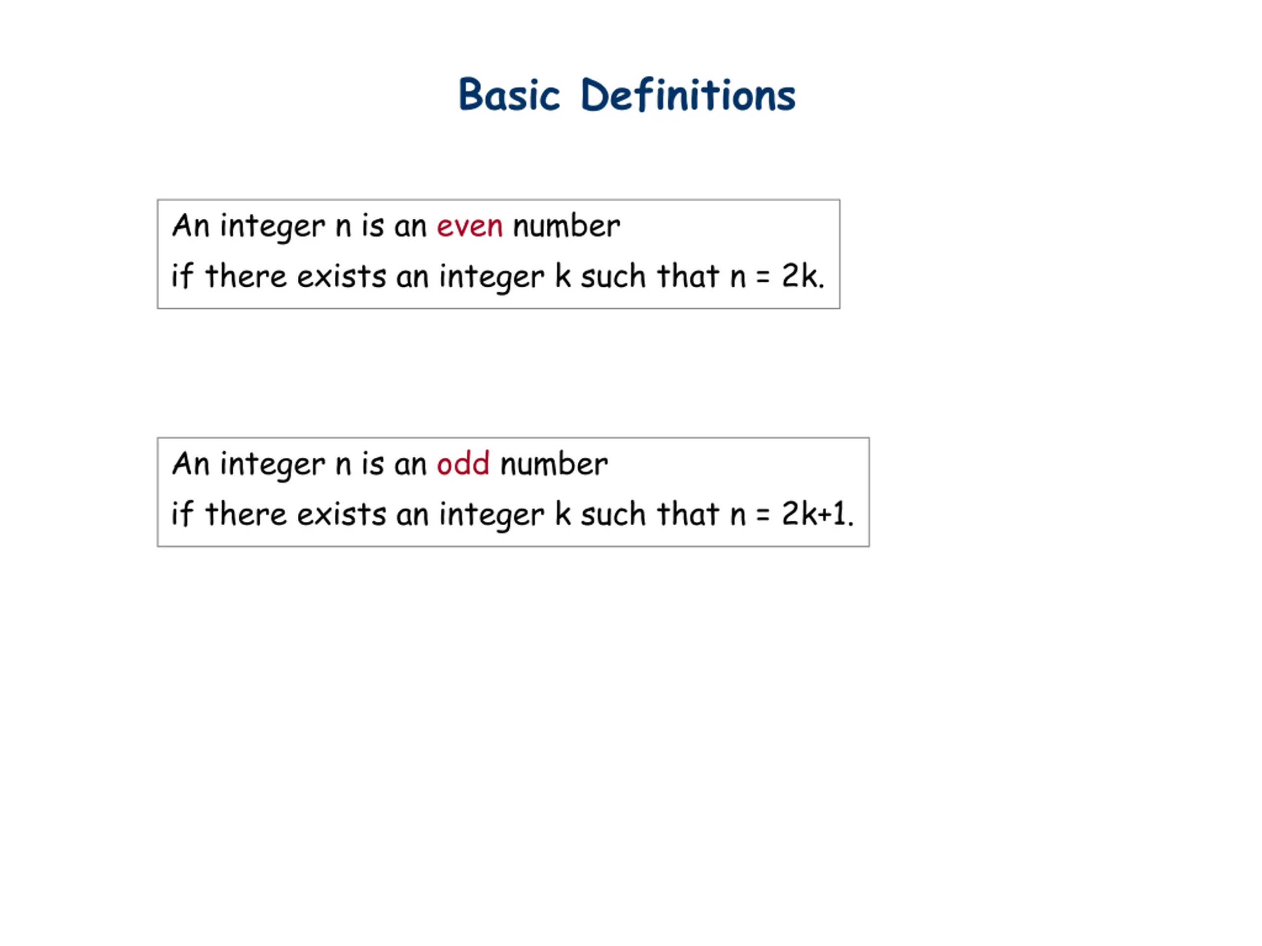 Basic Definitions An integer n is an even number if there exists an integer k such that n = 2k. An integer n is an odd number if there exists an integer k such that n = 2k+1.