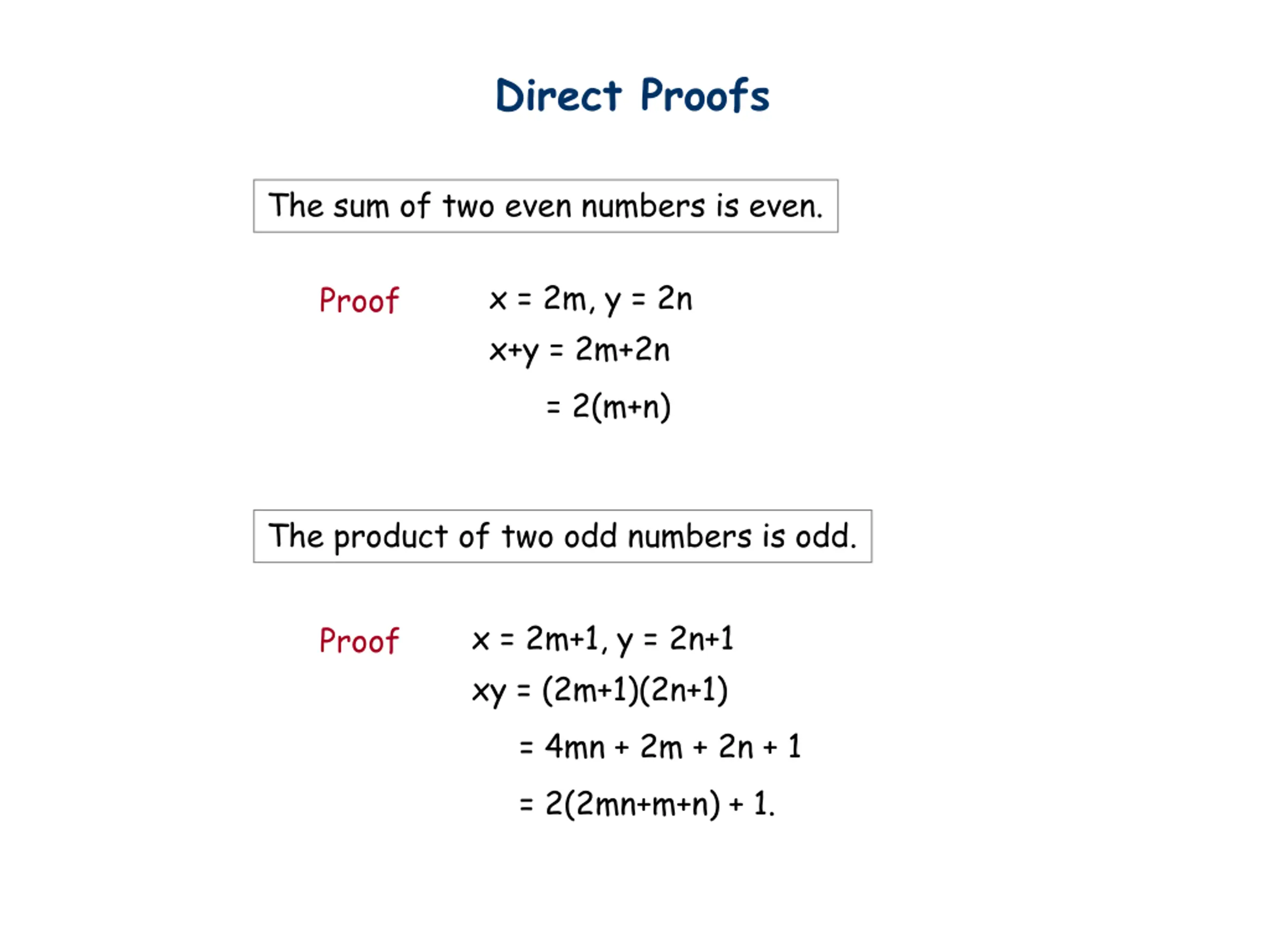 Direct Proofs The sum of two even numbers is even. x = 2m, y = 2n x+y = 2m+2n = 2(m+n) Proof The product of two odd numbers is odd. x = 2m+1, y = 2n+1 xy = (2m+1)(2n+1) = 4mn + 2m + 2n + 1 = 2(2mn+m+n) + 1. Proof