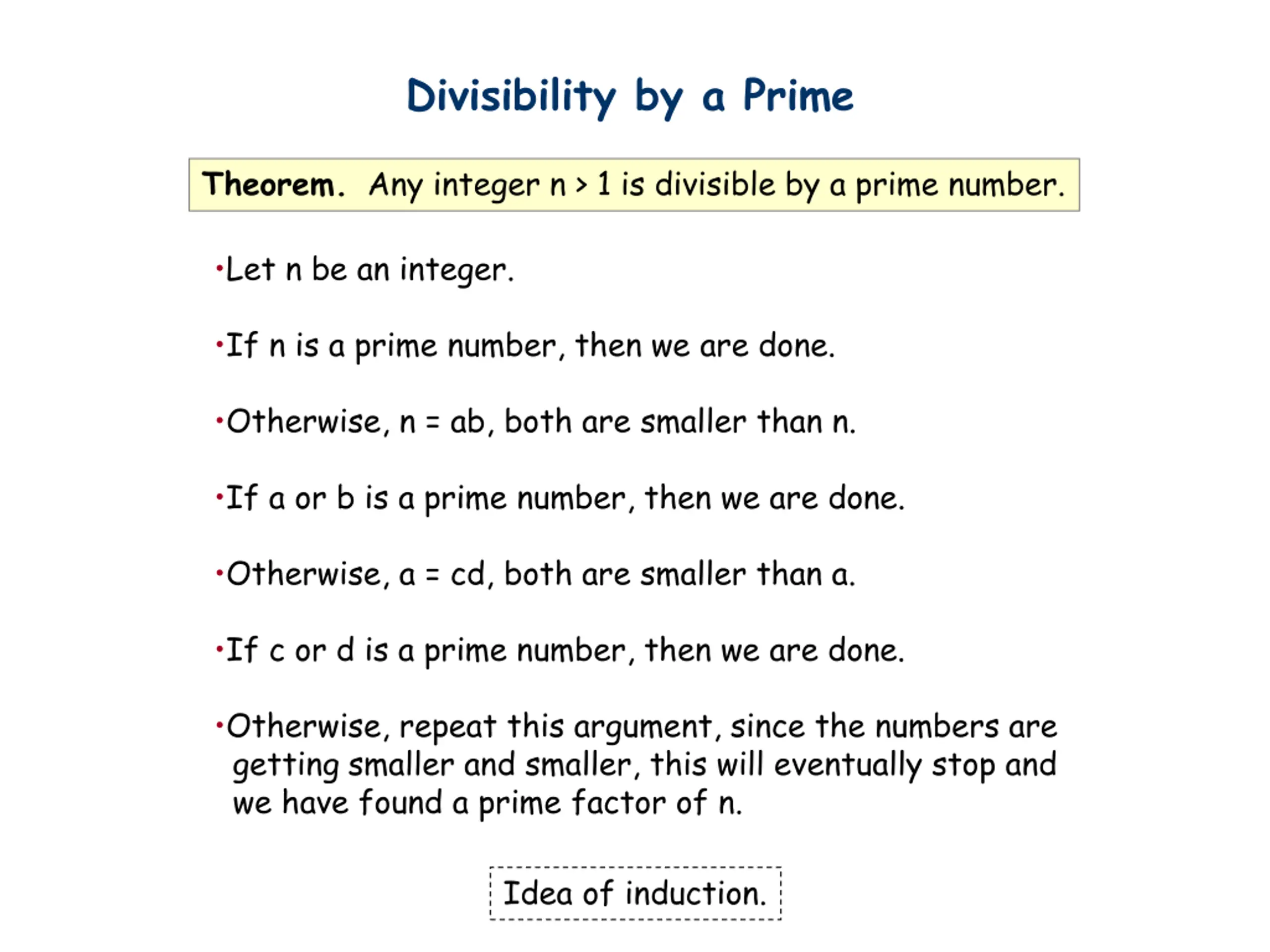 Divisibility by a Prime Theorem. Any integer n > 1 is divisible by a prime number. Let n be an integer. If n is a prime number, then we are done. Otherwise, n = ab, both are smaller than n. If a or b is a prime number, then we are done. Otherwise, a = cd, both are smaller than a. If c or d is a prime number, then we are done. Otherwise, repeat this argument, since the numbers are getting smaller and smaller, this will eventually stop and we have found a prime factor of n. Idea of induction.