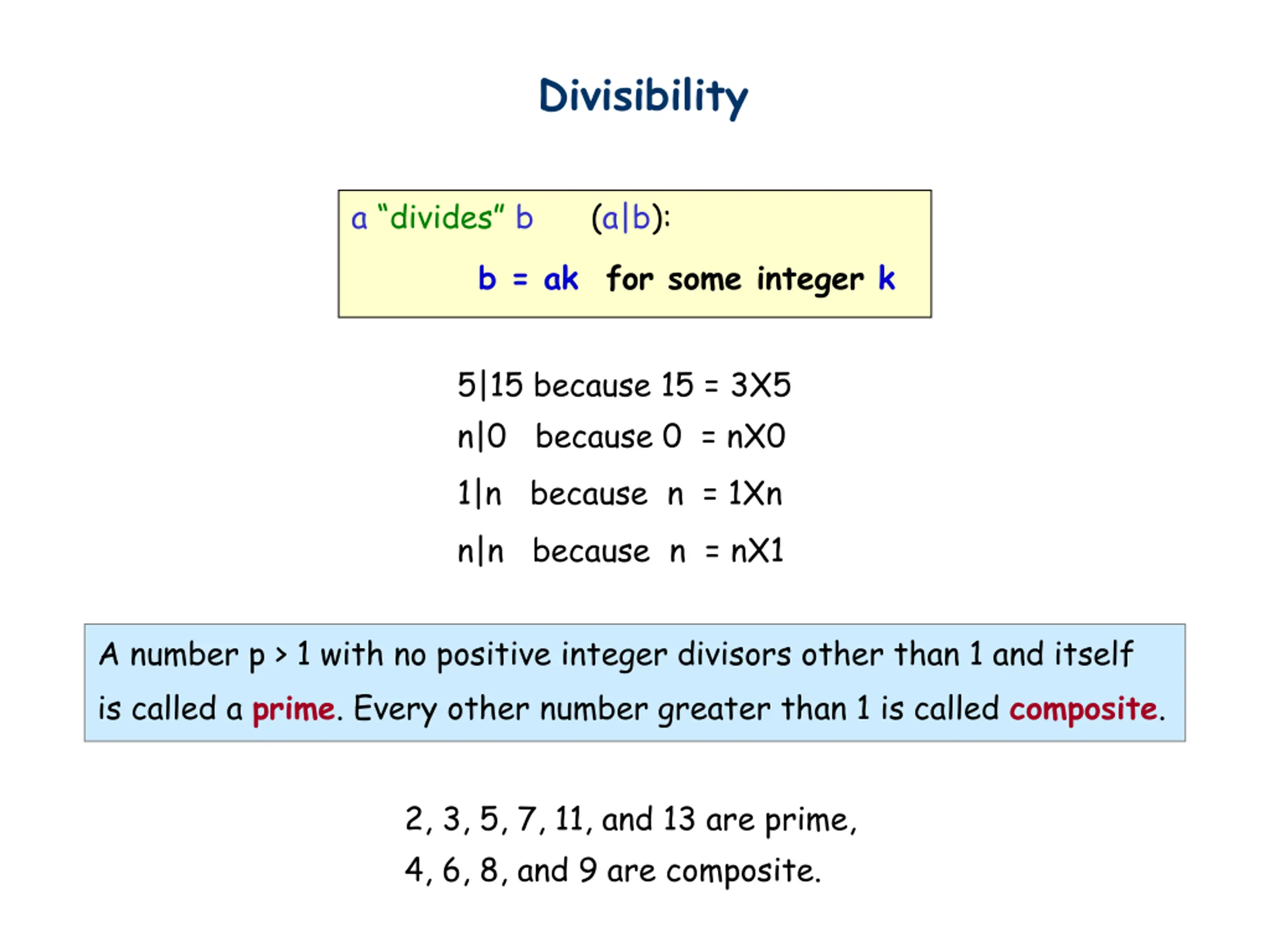 Divisibility a divides b (a|b): b = ak for some integer k 5|15 because 15 = 3X5 n|0 because 0 = nX0 1|n because n = 1Xn n|n because n = nX1 A number p > 1 with no positive integer divisors other than 1 and itself is called a prime. Every other number greater than 1 is called composite. 2, 3, 5, 7, 11, and 13 are prime, 4, 6, 8, and 9 are composite.