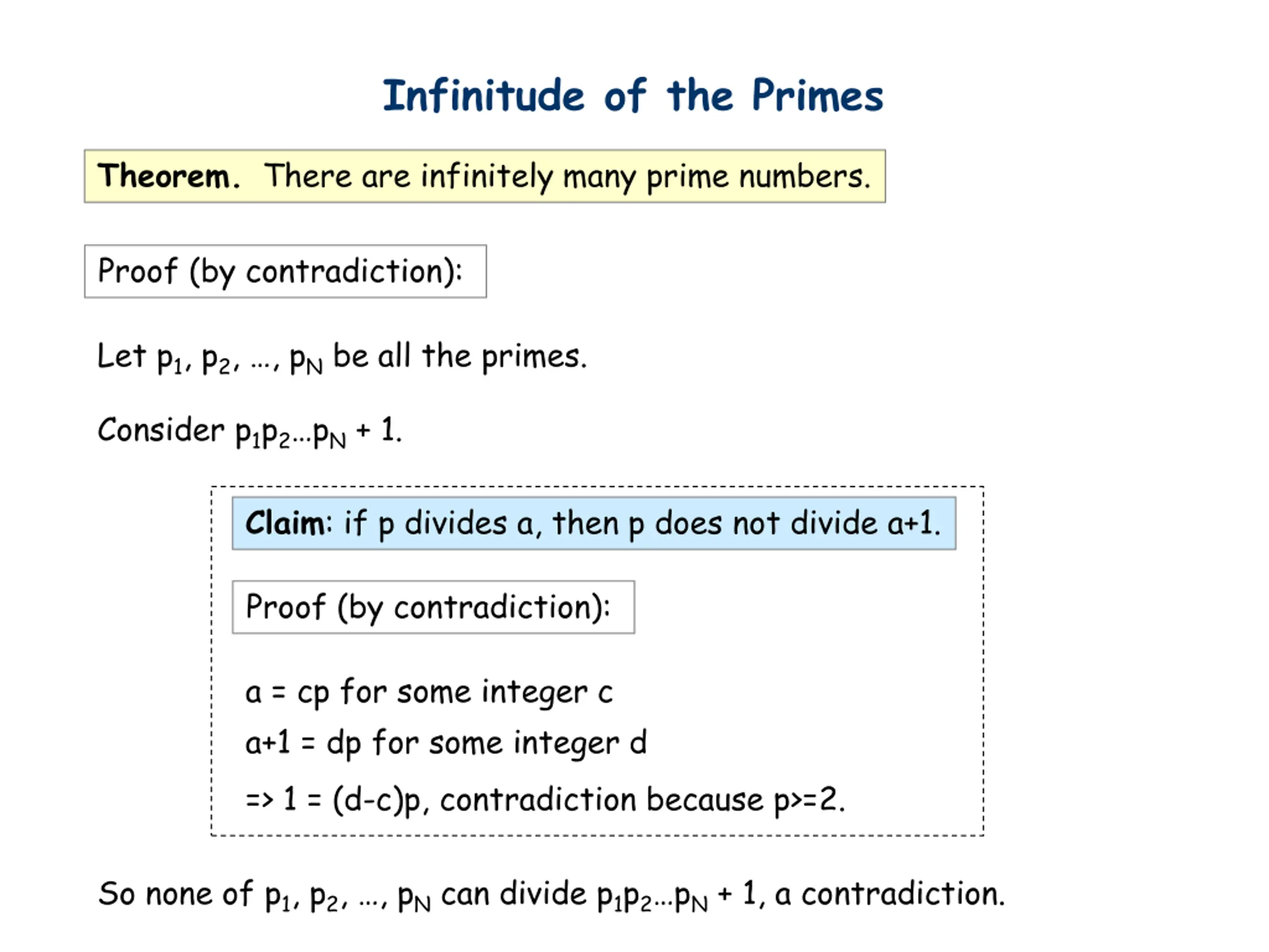 Infinitude of the Primes Theorem. There are infinitely many prime numbers. Proof (by contradiction): Let p1, p2, , pNbe all the primes. Consider p1p2 pN+ 1. Claim: if p divides a, then p does not divide a+1. Proof (by contradiction): a = cp for some integer c a+1 = dp for some integer d => 1 = (d-c)p, contradiction because p>=2. So none of p1, p2, , pNcan divide p1p2 pN+ 1, a contradiction.