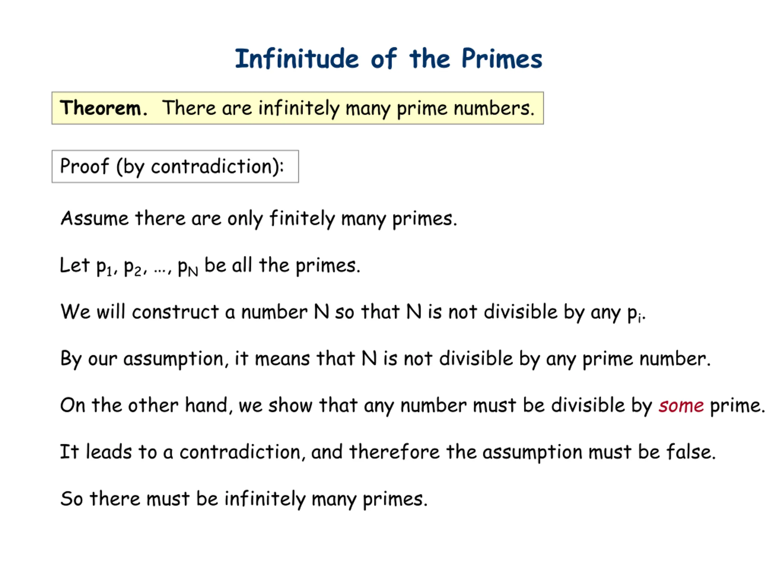 Infinitude of the Primes Theorem. There are infinitely many prime numbers. Proof (by contradiction): Assume there are only finitely many primes. Let p1, p2, , pNbe all the primes. We will construct a number N so that N is not divisible by any pi. By our assumption, it means that N is not divisible by any prime number. On the other hand, we show that any number must be divisible by some prime. It leads to a contradiction, and therefore the assumption must be false. So there must be infinitely many primes.