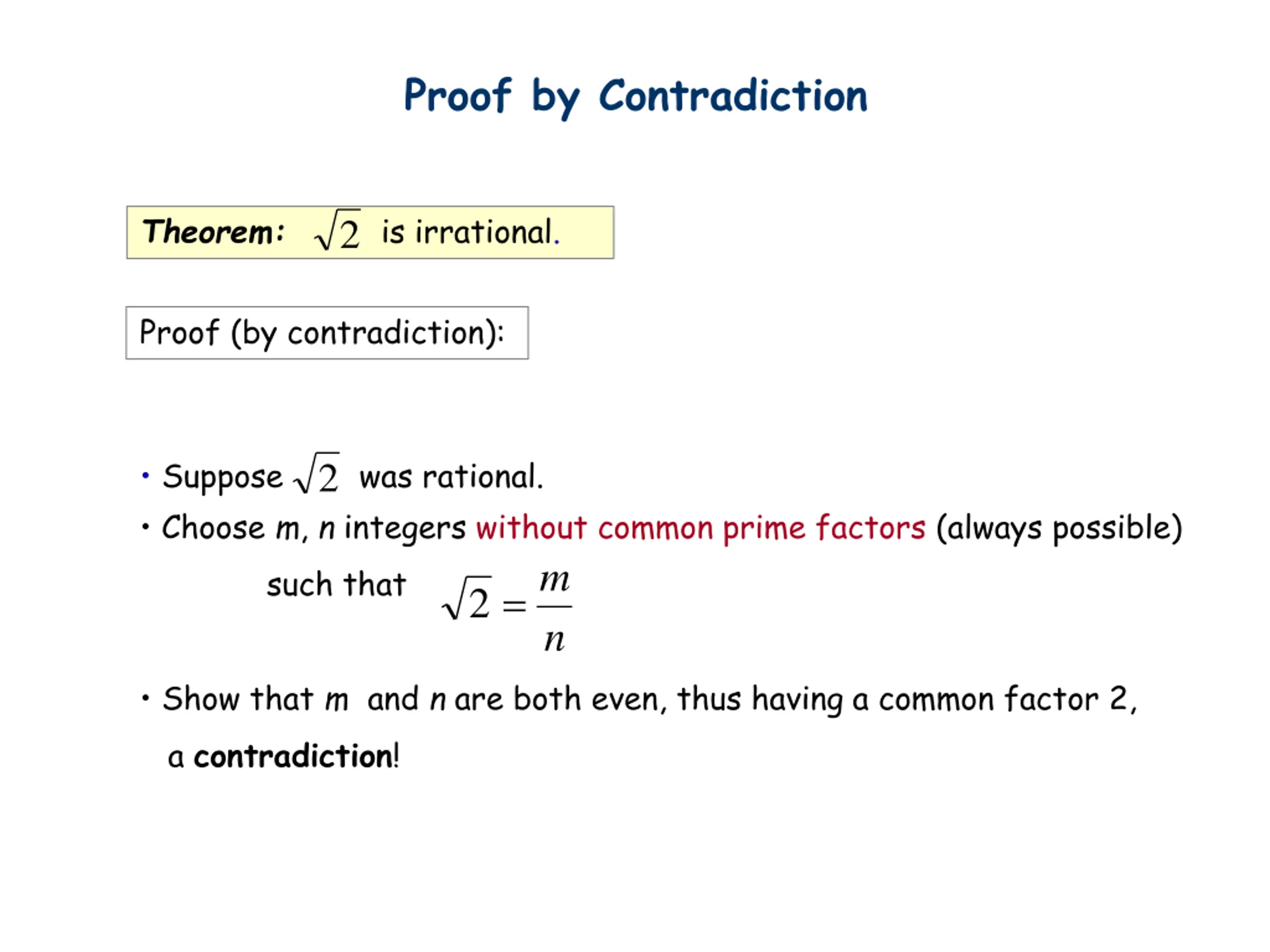 Proof by Contradiction Theorem: is irrational. 2 Proof (by contradiction): Suppose was rational. Choose m, n integers without common prime factors (always possible) such that n 2 m = 2 Show that m and n are both even, thus having a common factor 2, a contradiction!