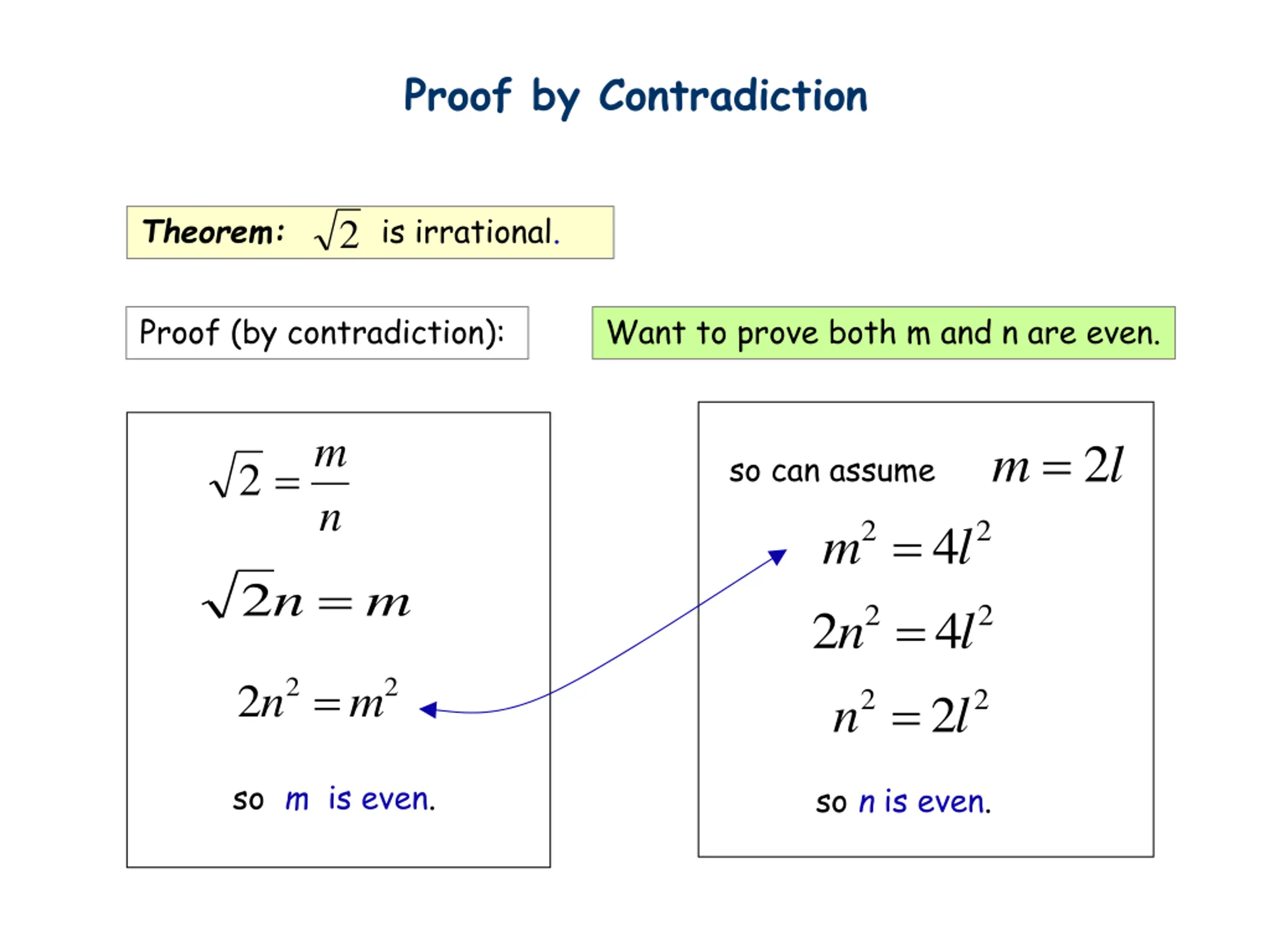 Proof by Contradiction Theorem: is irrational. 2 Proof (by contradiction): Want to prove both m and n are even. m = 2 m l so can assume = 2 n = = 2 2 4 4 m 2 l n = 2 m 2 2 n l n = 2 2 2 m n = 2 2 2l so m is even. so n is even.